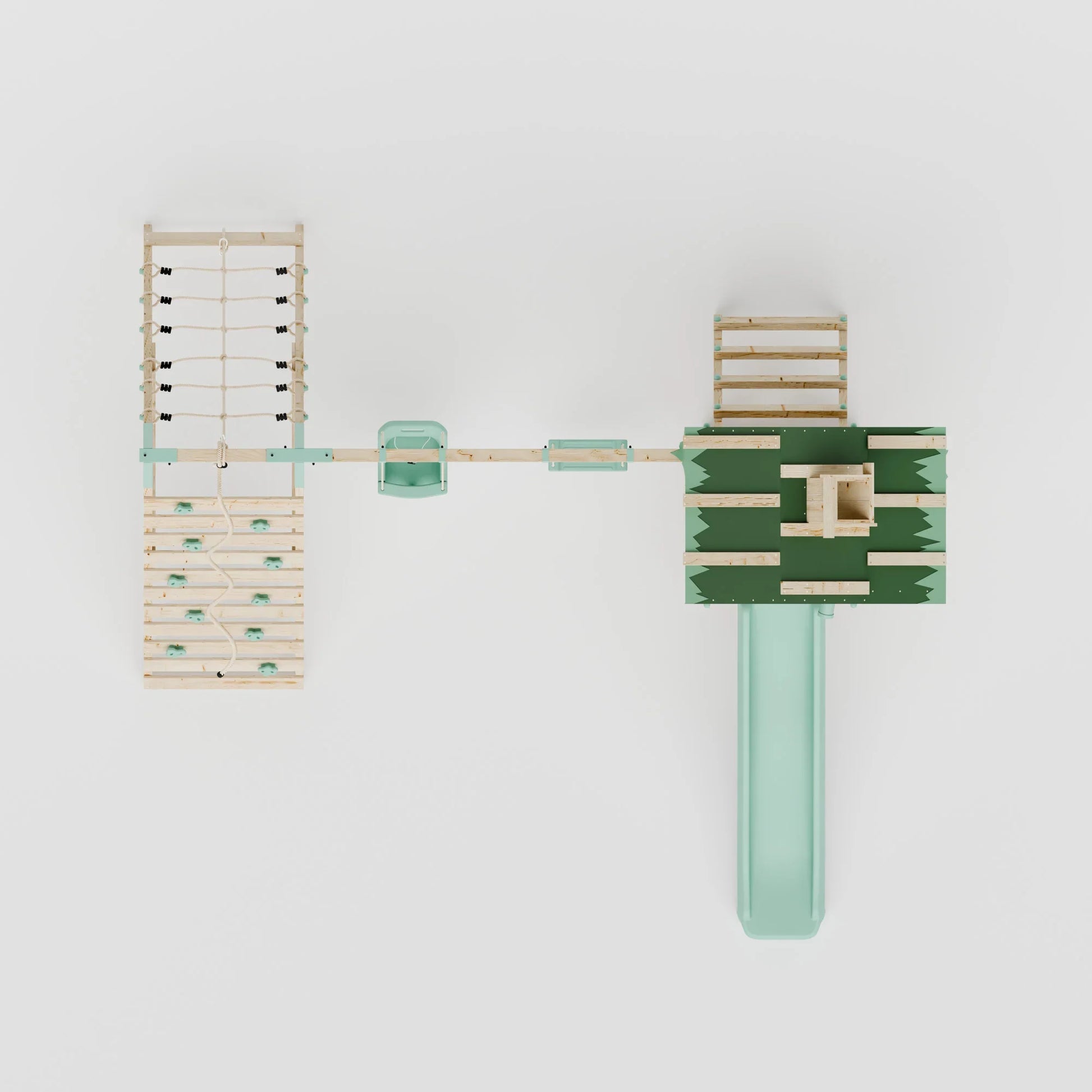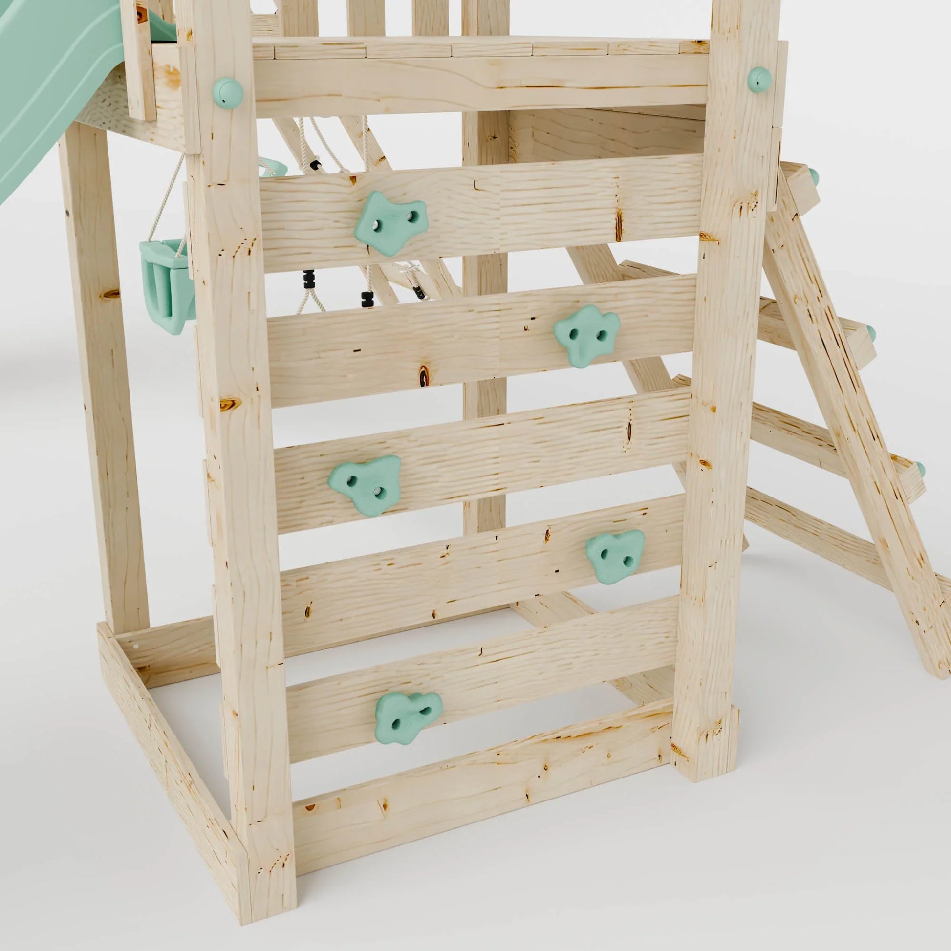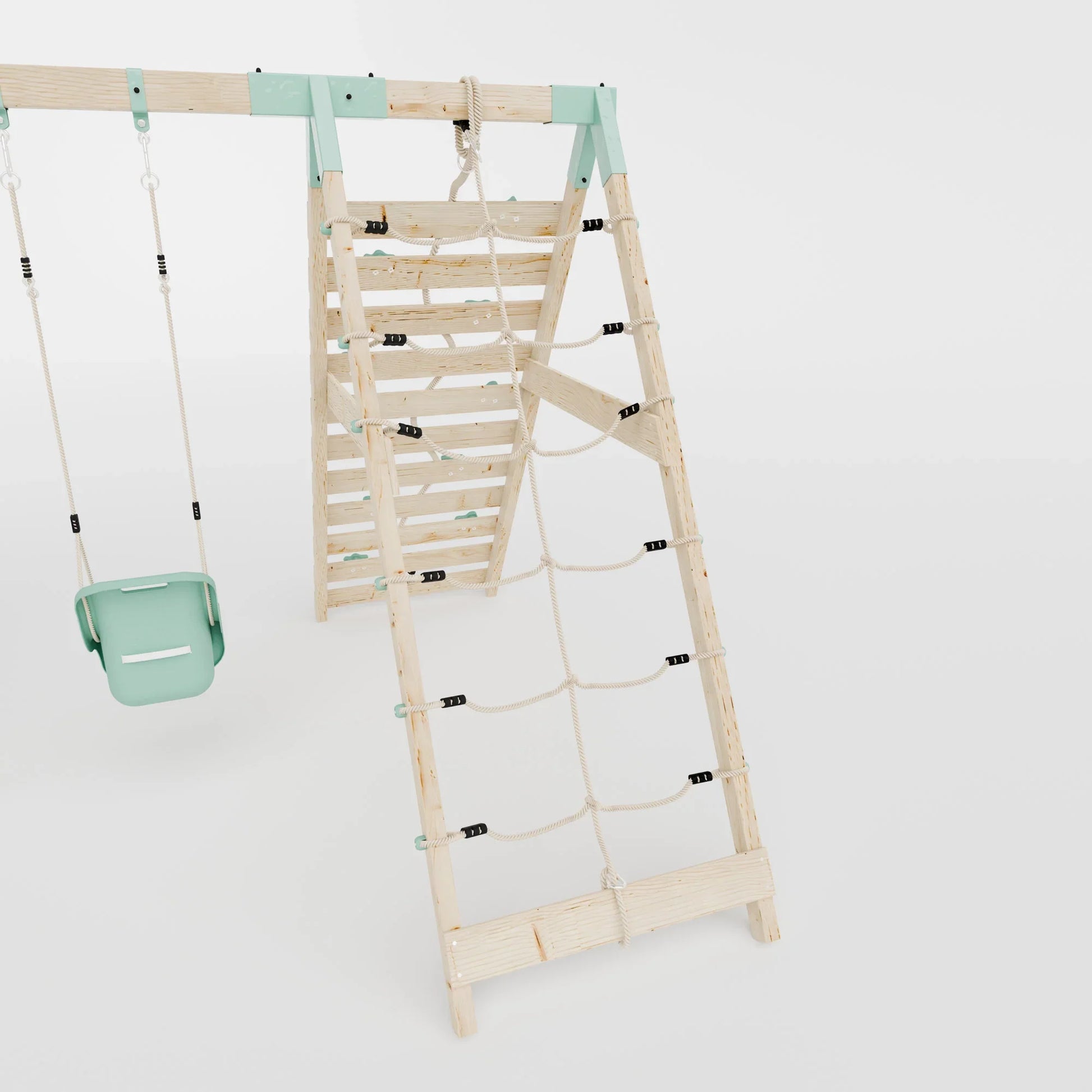 Transform your garden into a haven of exploration and fun with the Climbing Frame With Double Swing & Climbing Wall - Eldertree Forest VI. This popular, designer outdoor playset combines a natural, Scandinavian-inspired look with gentle wood tones, beautifully complemented by pastel blue features. Its inviting design makes it an eye-catching and harmonious addition to any garden space.