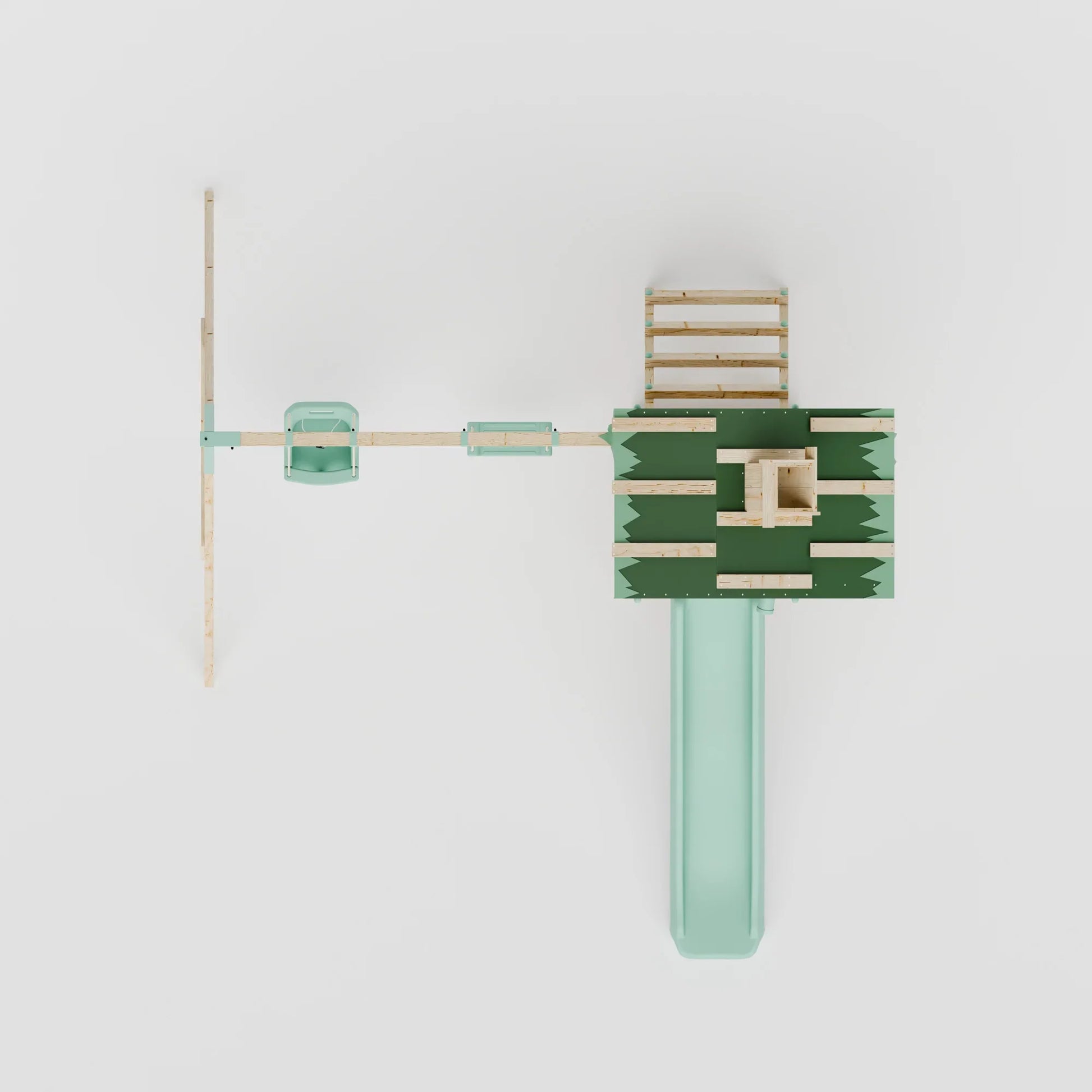 Children can climb, slide, and swing in comfort and safety. This popular and high-quality climbing frame features a classic play tower equipped with a spinnable wheel and telescope for imaginative fun. Alongside the main structure, you’ll find both a standard swing and a baby swing, perfect for siblings or friends at different stages of development. A climbing wall with sculpted holds and supporting rope encourages physical challenge and builds coordination and confidence.