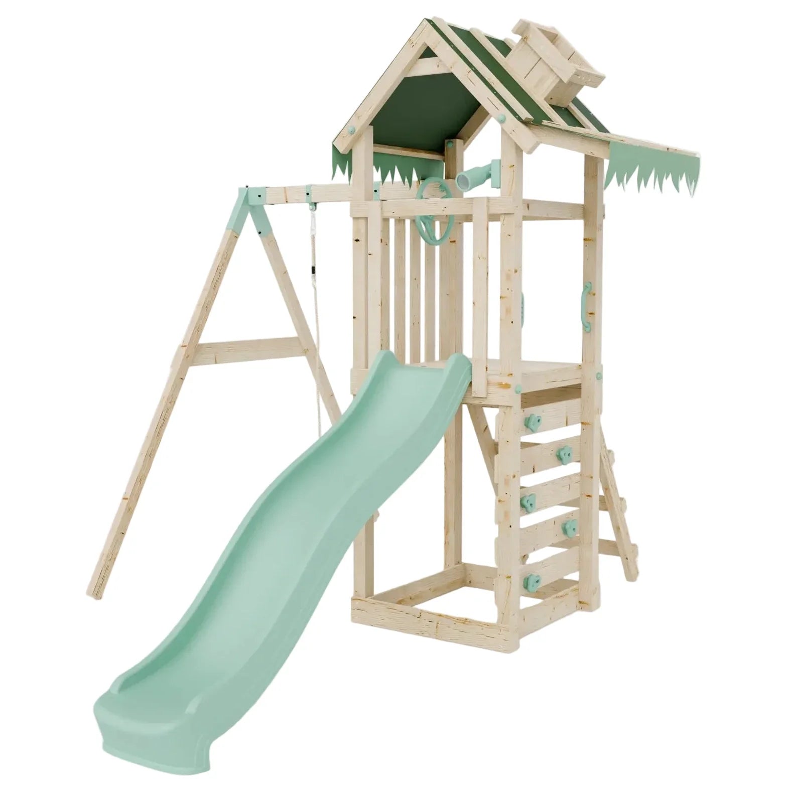 Transform your garden into a world of adventure with the Climbing Frame With Single Swing - Eldertree Forest I. This popular, high-quality play structure captures the spirit of imaginative outdoor play, offering children the perfect place to climb, swing and slide. The versatile set features a wide plastic slide with safe, raised sides and a single comfortable swing, all anchored to a charming treehouse-inspired tower.