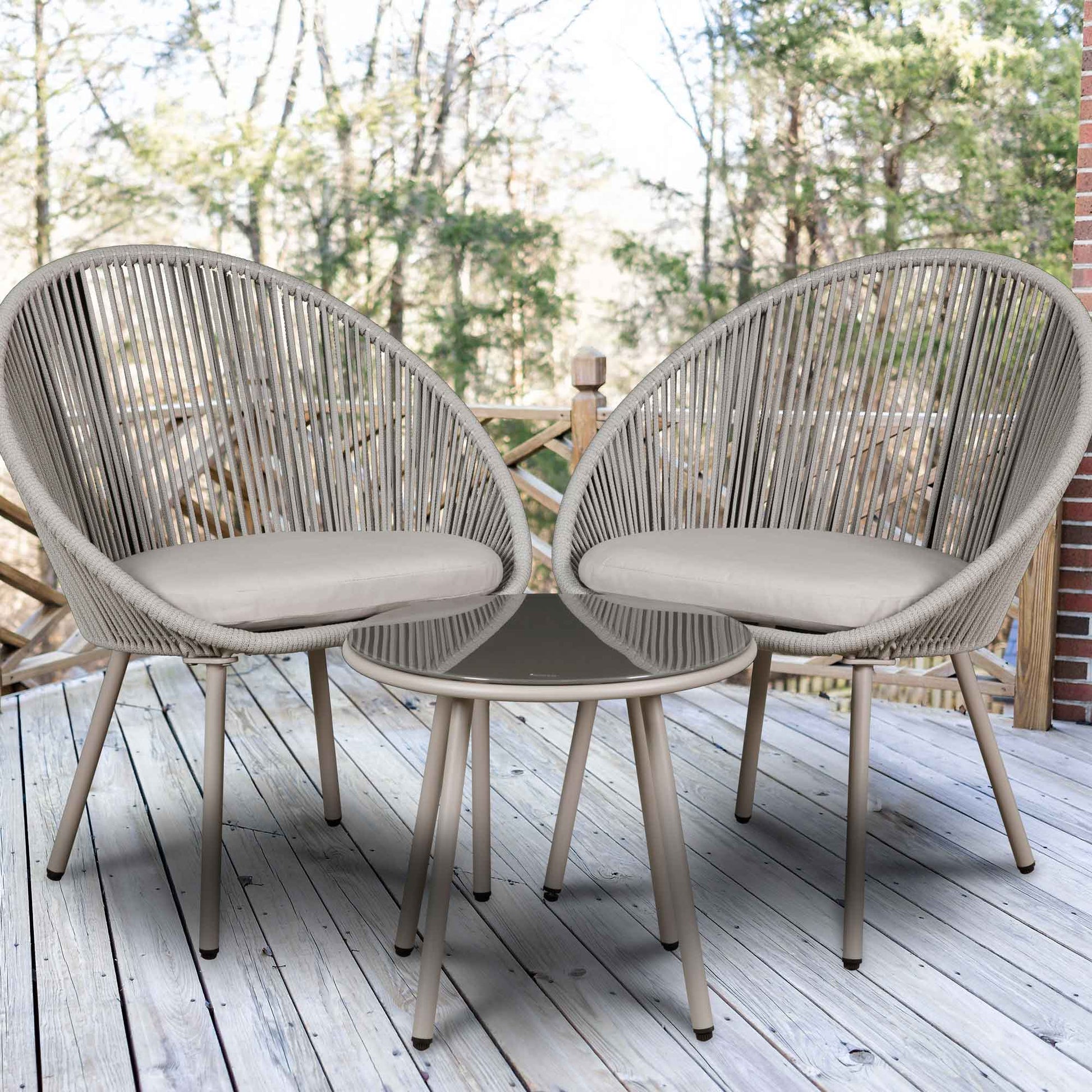 - Set includes 2 chairs and tempered glass-top table. This product is made with high quality steel, and should be stored inside, or stored with a waterproof cover to maximise protection. Product Dimensions - Chairs 65 x 71 x 85cm - Table 50 x 46cm (Ø x H). Some assembly is required. Colours may slightly vary due to lighting conditions. Comes with a 3 year Warranty for your peace of mind.