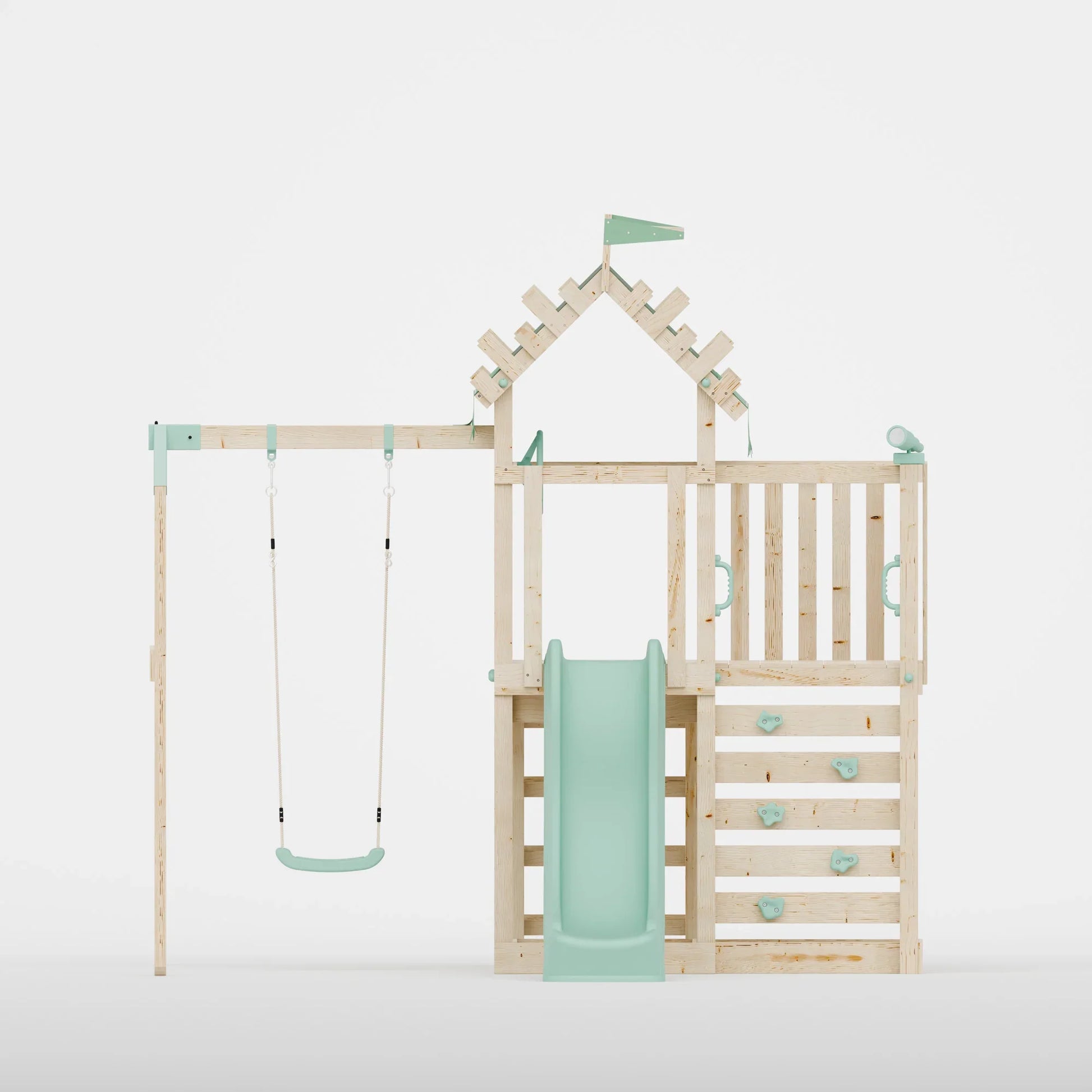 The climbing frame features a charming pastel blue slide, a secure swing, a ship’s wheel, and a telescope—perfect for little adventurers eager to embark on exciting make-believe journeys. With both a rock wall and a wooden ladder, children enjoy two fun ways to access the platform, supporting the development of hand-eye coordination, balance, and physical activity.