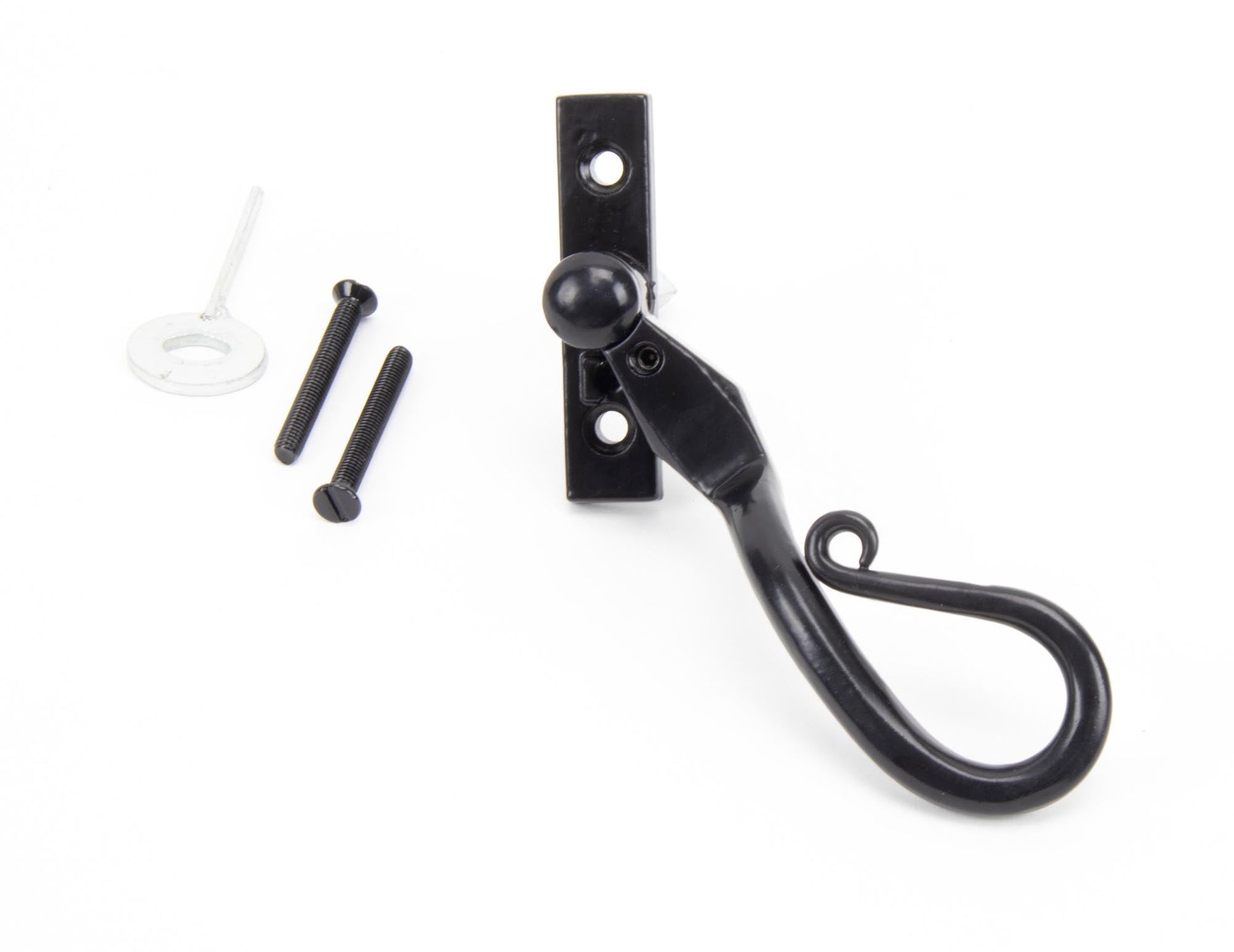 The image showcases a beautifully hand-forged window fastener, its surface enhanced by subtle curves and elegant details. The handle forms a graceful crook, reminiscent of the classic shepherd’s crook design, lending a touch of period character and timeless charm to any setting. This piece exudes both heritage appeal and a dignified contemporary look, perfect for those seeking a sophisticated addition to their windows.