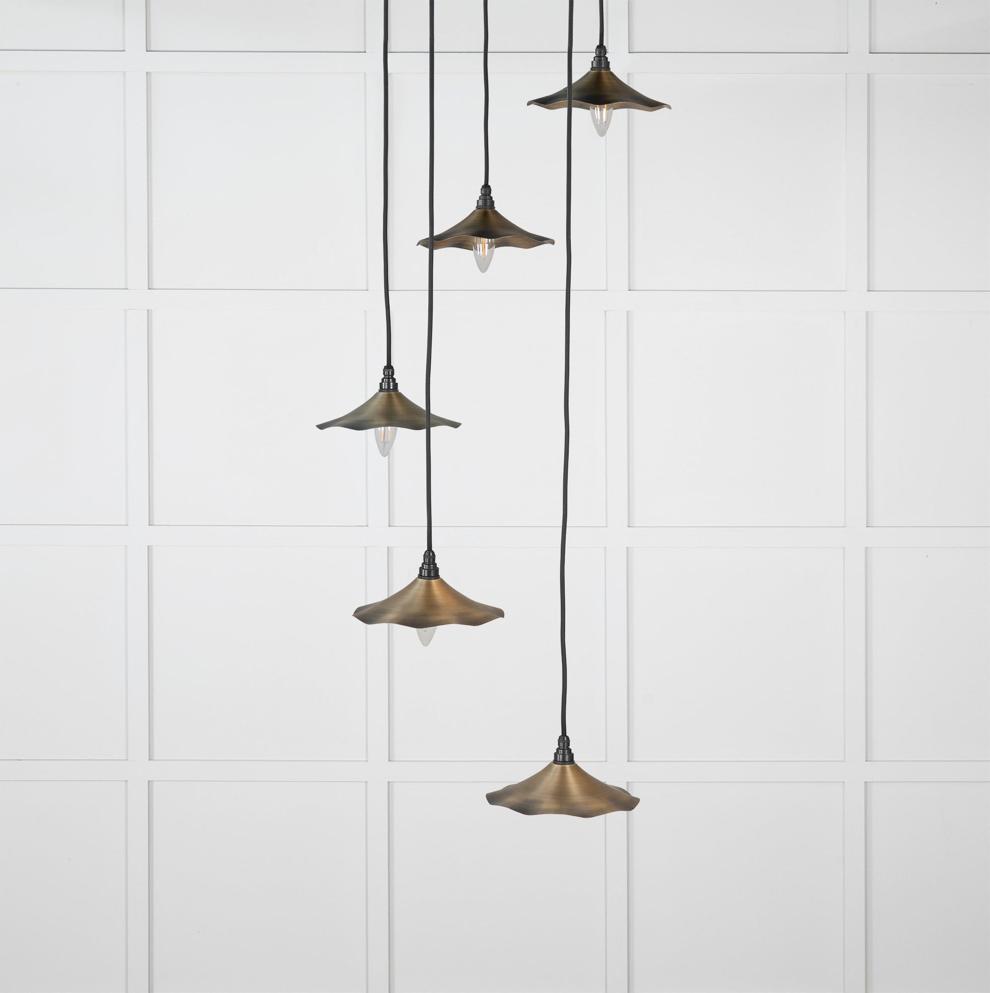 The image depicts an elegant grouping of five pendants, gracefully suspended at varying heights, each featuring soft, flowing curves reminiscent of botanical forms. The aged brass finish radiates a gentle warmth, while the interplay of light across the undulating surfaces lends a tranquil, inviting atmosphere to any interior.