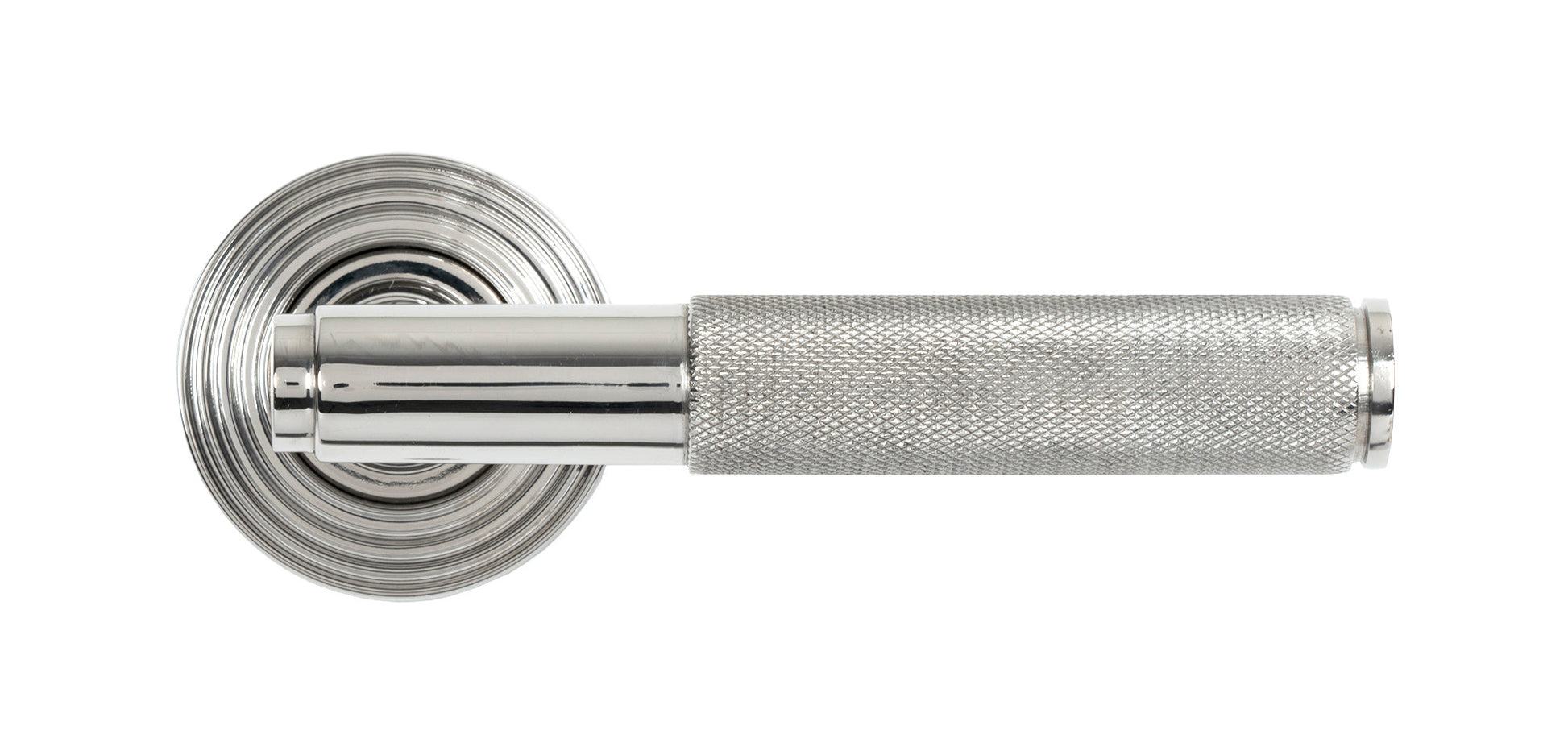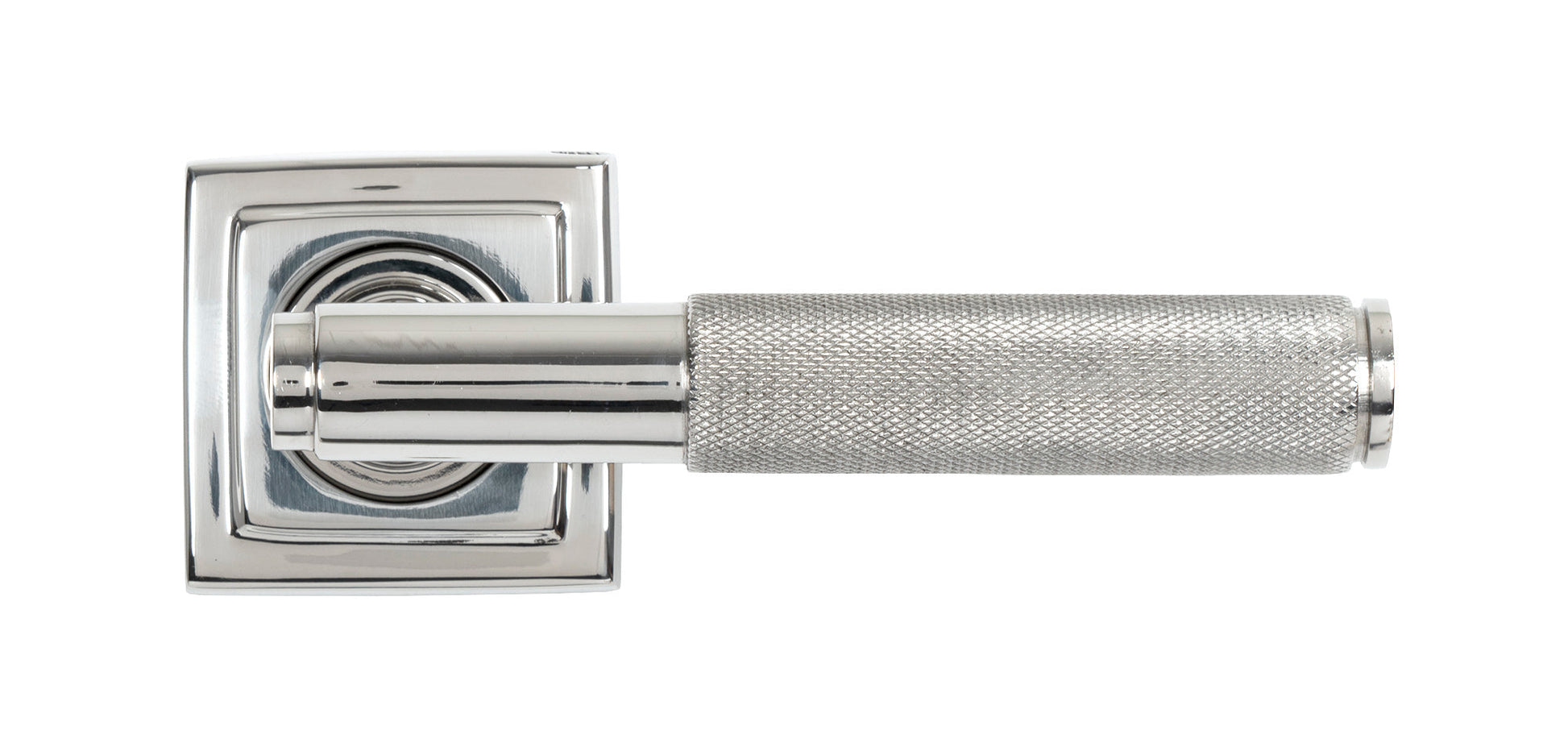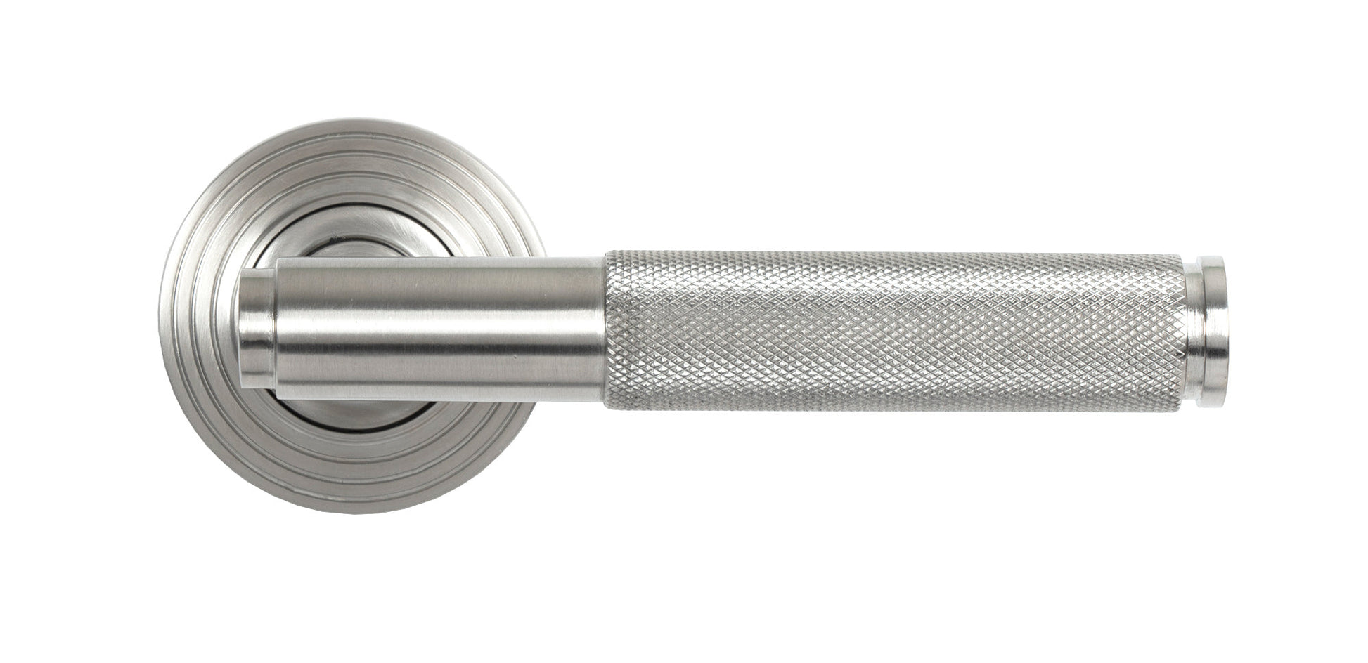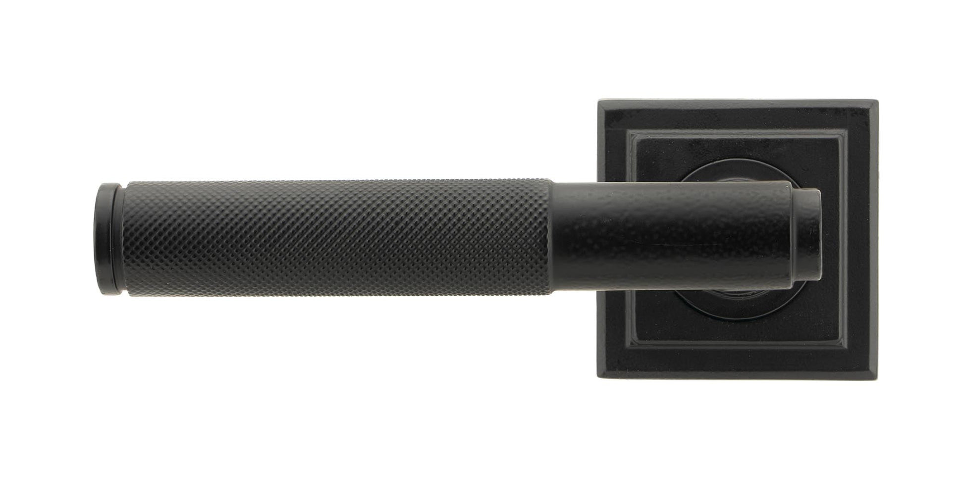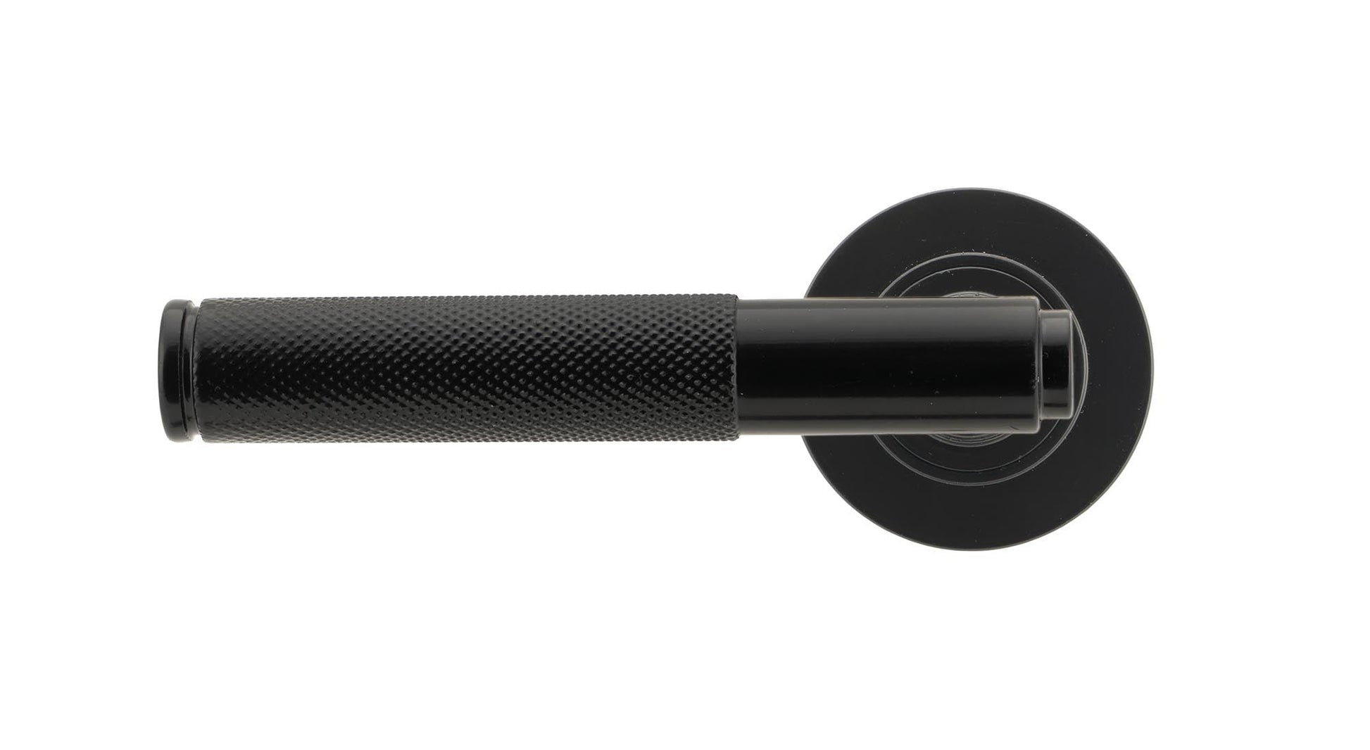 In the image, the Brompton Lever On Rose Set (Unsprung) displays a striking, modern aesthetic. Its lever is adorned with a beautifully textured, knurled diamond pattern, evoking an industrial look that is both bold and refined. The stepped Art Deco rose base adds a subtle touch of traditional sophistication, perfectly balancing contemporary design elements with classic influences. The concealed fixings give the handles a seamless and minimalist appearance, ensuring they complement a wide range of interior styles.