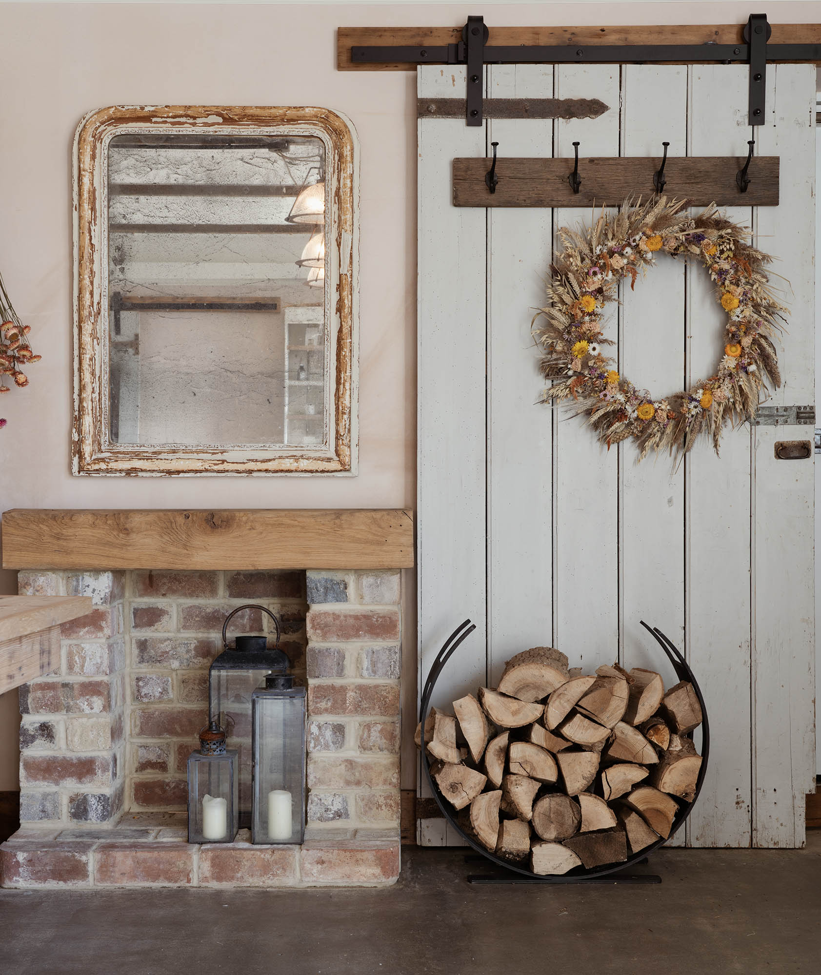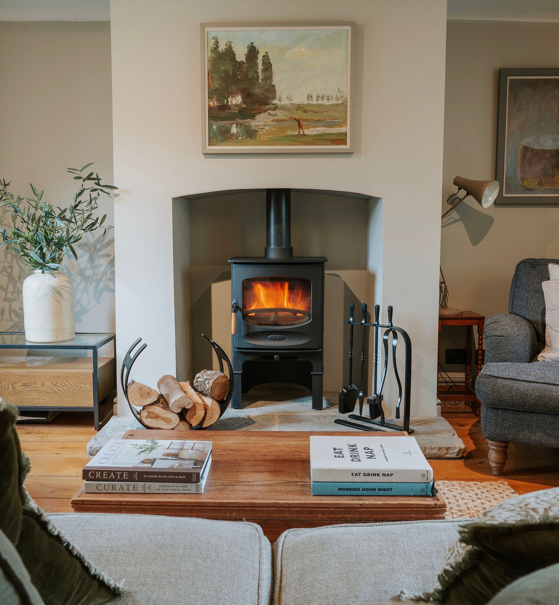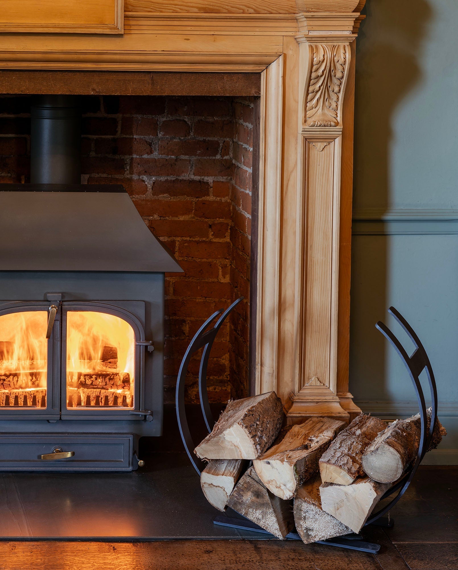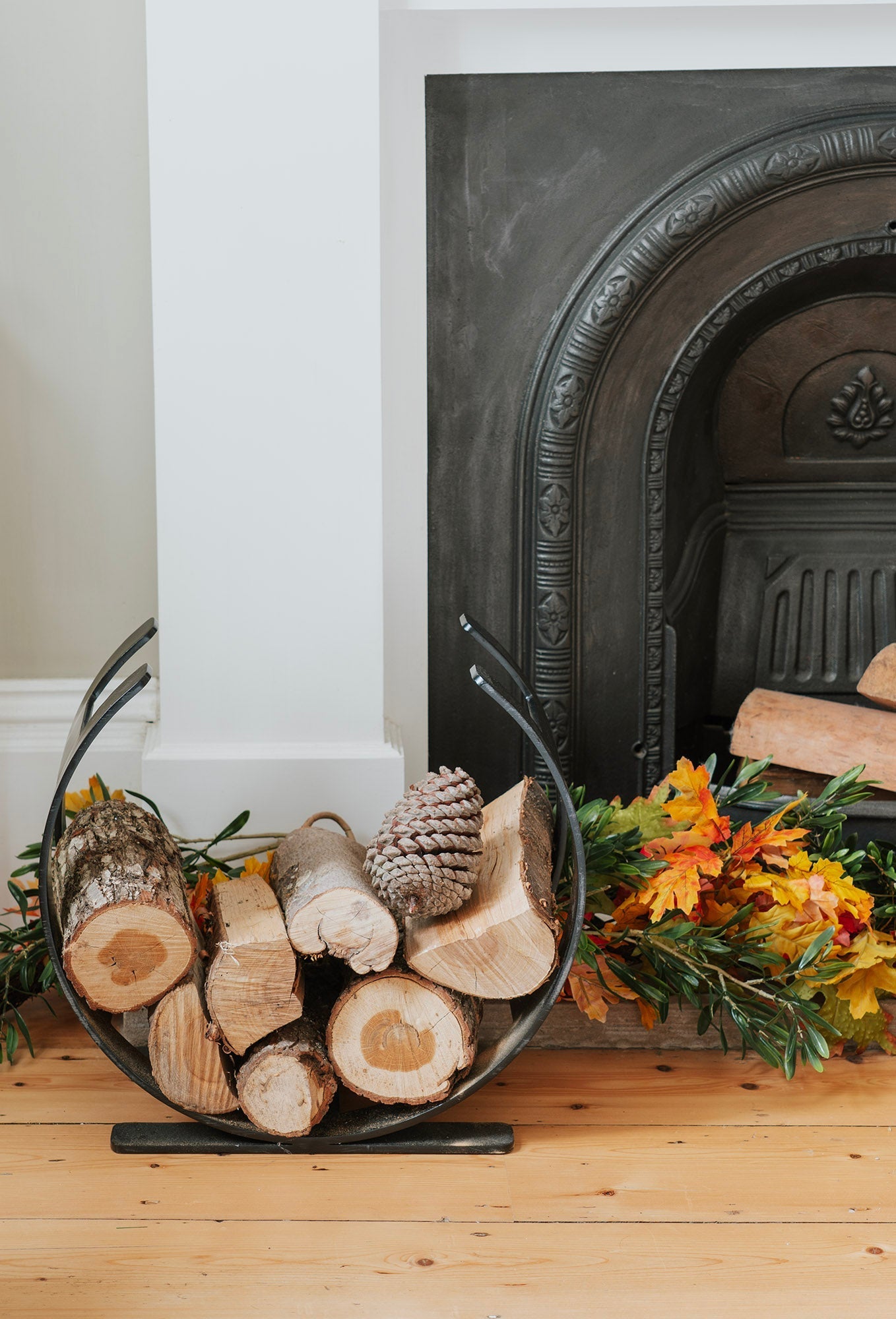 The image features a beautifully hand-forged log holder with an elegant, sweeping curve. The minimalist silhouette exudes timeless appeal, and its striking shape makes for a stunning accent beside a fireplace or wood burner. This piece radiates both strength and aesthetic charm, creating an inviting, organised space in any living room or hearth setting.