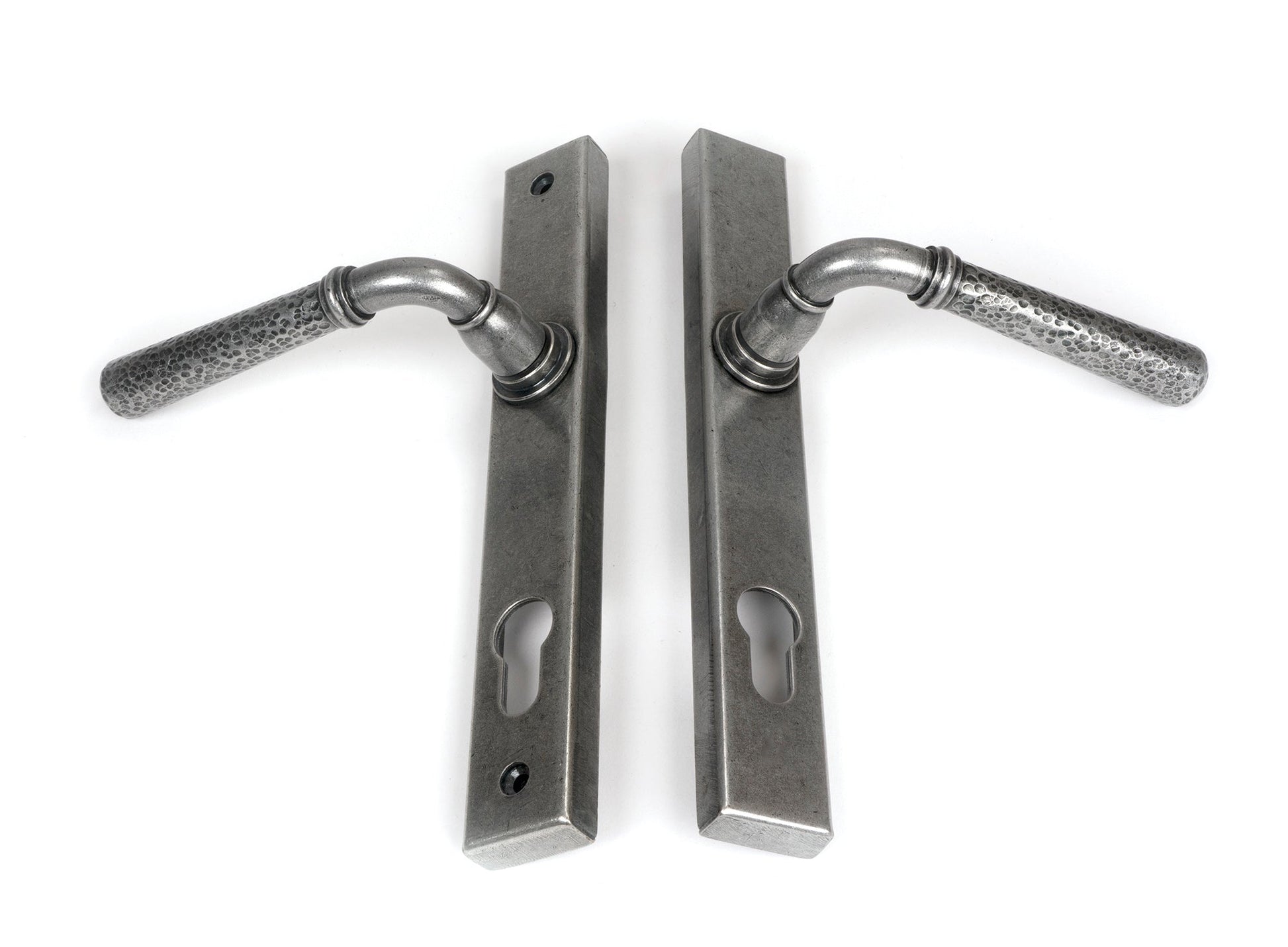 The From The Anvil Hammered Newbury Slimline Espag. Lock Set comes from a renowned British brand celebrated for its exquisite craftsmanship and high-quality ironmongery. Setting a benchmark in both style and substance, these striking handles merge classic techniques with contemporary design, making them a desirable choice for discerning homeowners and designers alike.