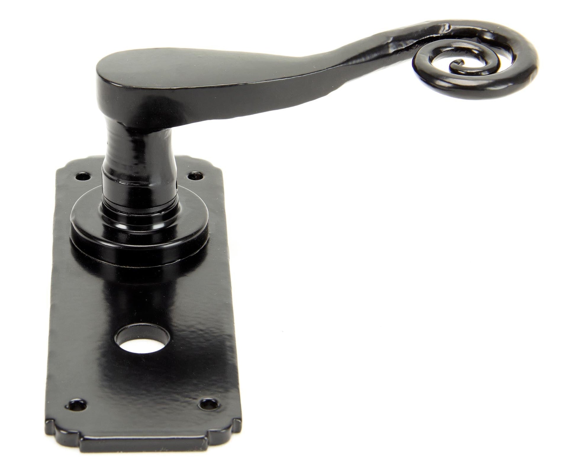 The image showcases an elegant pair of lever handles, exquisitely finished with a unique, curled monkeytail design. The dark, radiant surface is accented by a subtle hammered texture, reflecting the skilled handiwork that goes into each piece. The graceful curves and stylish lines make the handles a striking feature for any bathroom interior, blending seamlessly with both period properties and modern spaces seeking a heritage touch.
