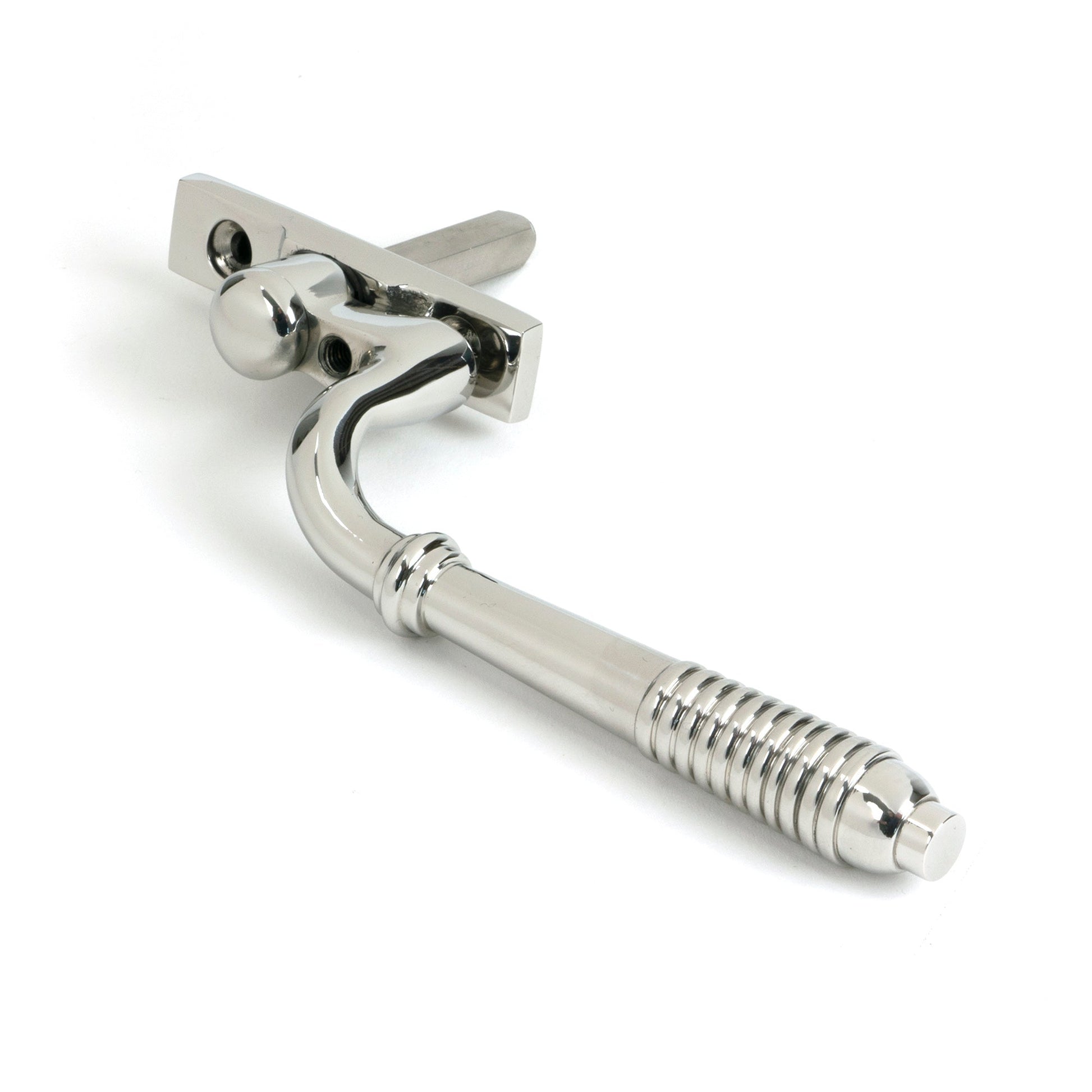 The product image showcases an elegant espag handle, gracefully curved with a refined, reeded design on the end. The handle’s detailed ridges reflect the precise hand finishing skilfully undertaken by expert craftsmen, and its clean lines and classic regency aesthetic contribute a sophisticated touch to any window. The lustrous appearance adds a statement feature, enhancing contemporary and traditional décors alike.