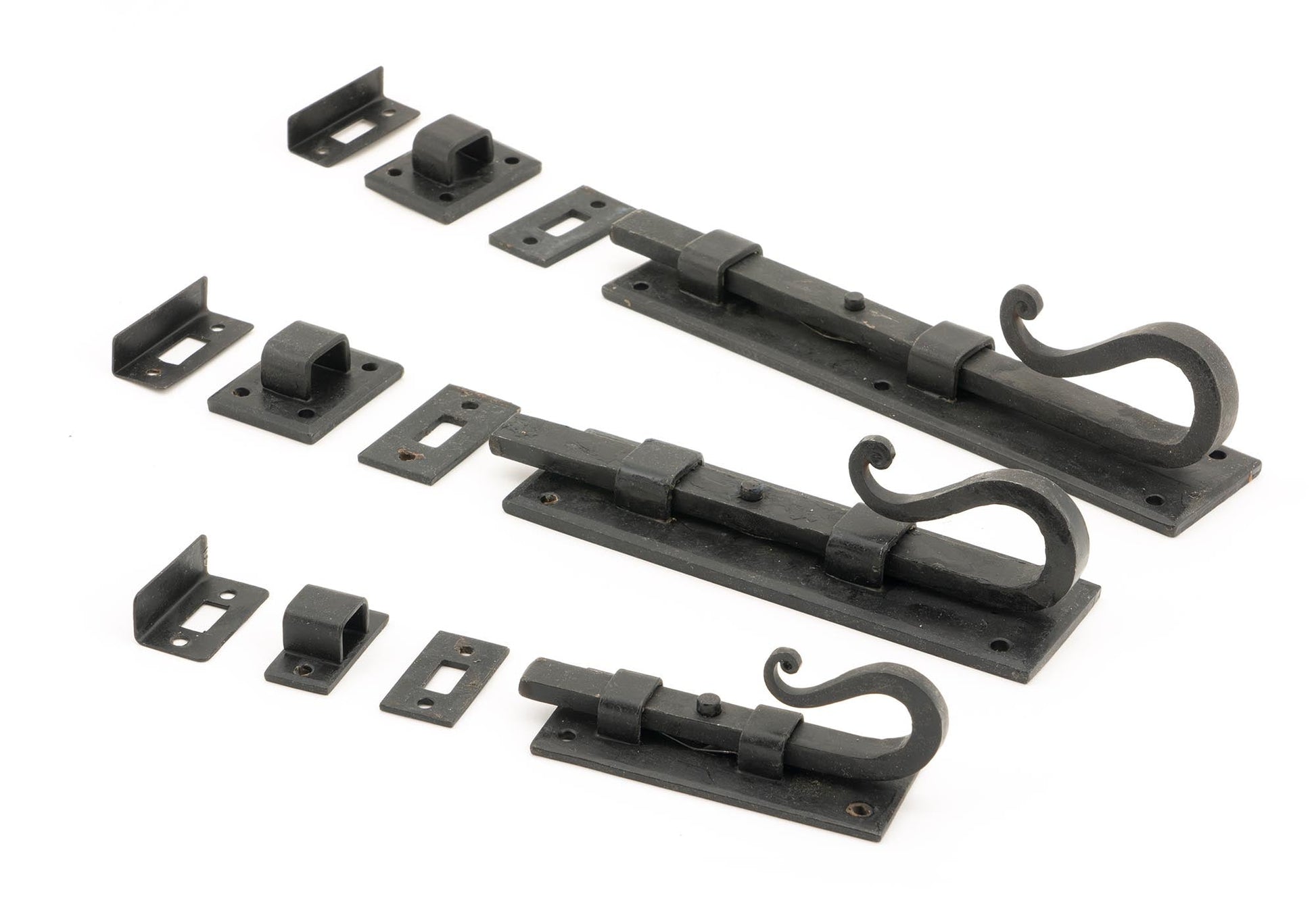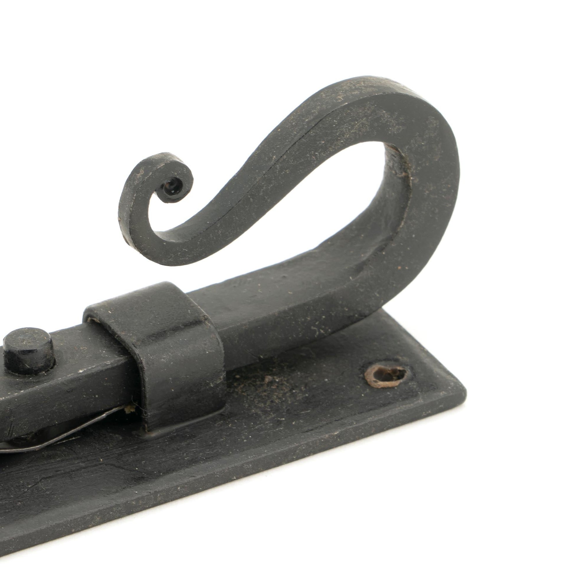 The image shows a beautifully crafted bolt, featuring classic styling and traditional hand-forged detailing. The gently sweeping crook shape at one end reflects artisan workmanship, while the bolt sits confidently alongside a set of coordinated fixings. Presented in a way that highlights its robust construction and designer influences, its distinctive silhouette ensures it can complement a variety of settings and architectural styles. The set exudes timeless charm, fitting harmoniously into both period and modern homes.