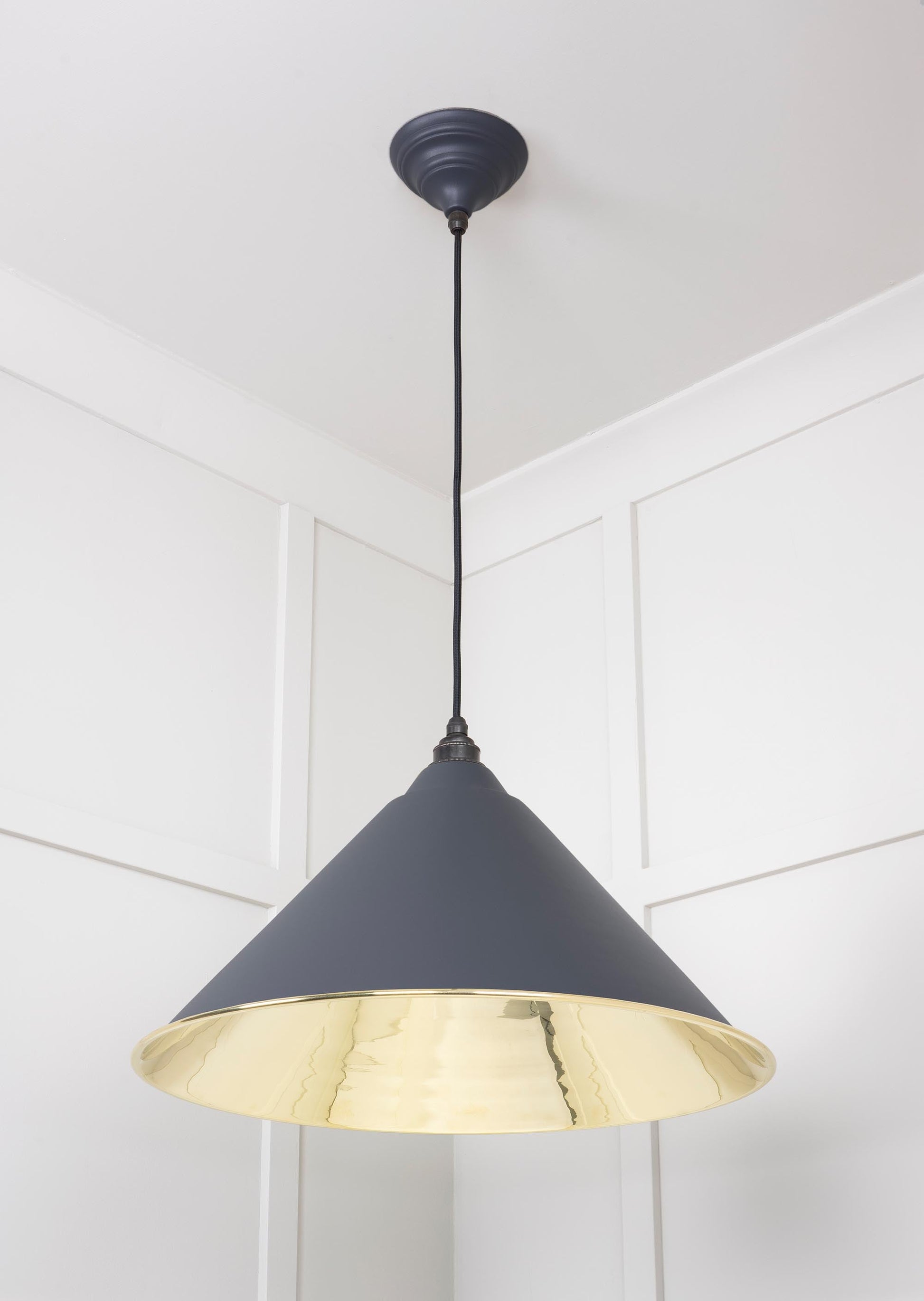 The From The Anvil Smooth Brass Hockley Pendant is designed to bring both drama and subtlety into your home. Whether installed individually for a striking focal point or grouped to create a more dramatic impact, these ceiling pendants enhance any space with their understated elegance and versatile styling, as described in the product’s details.