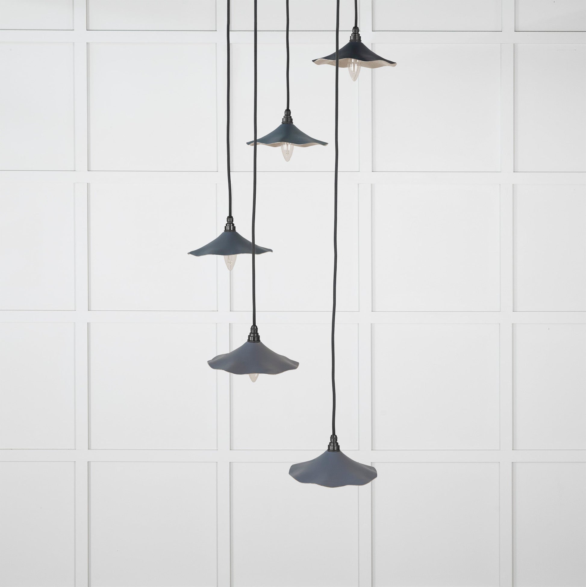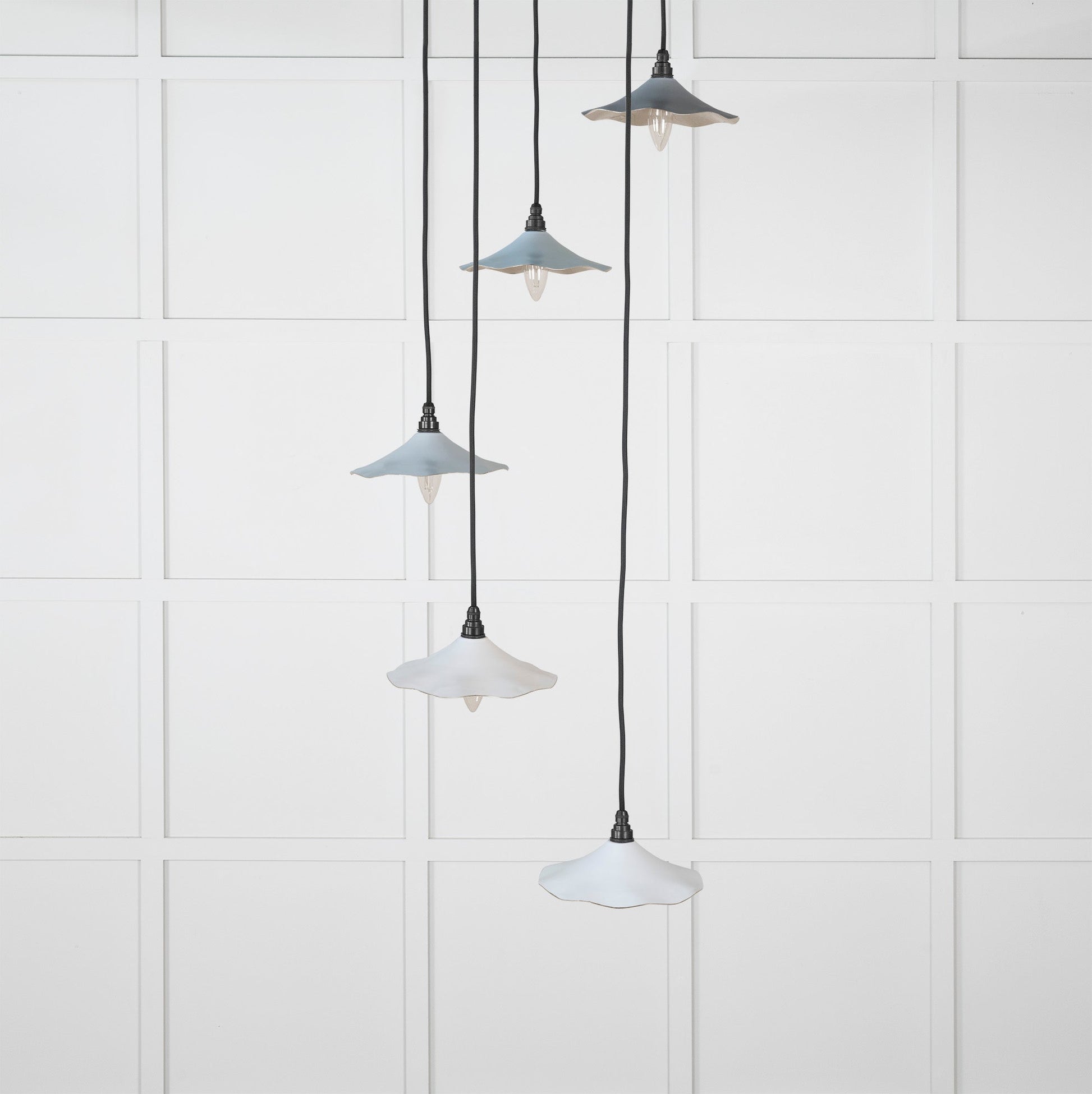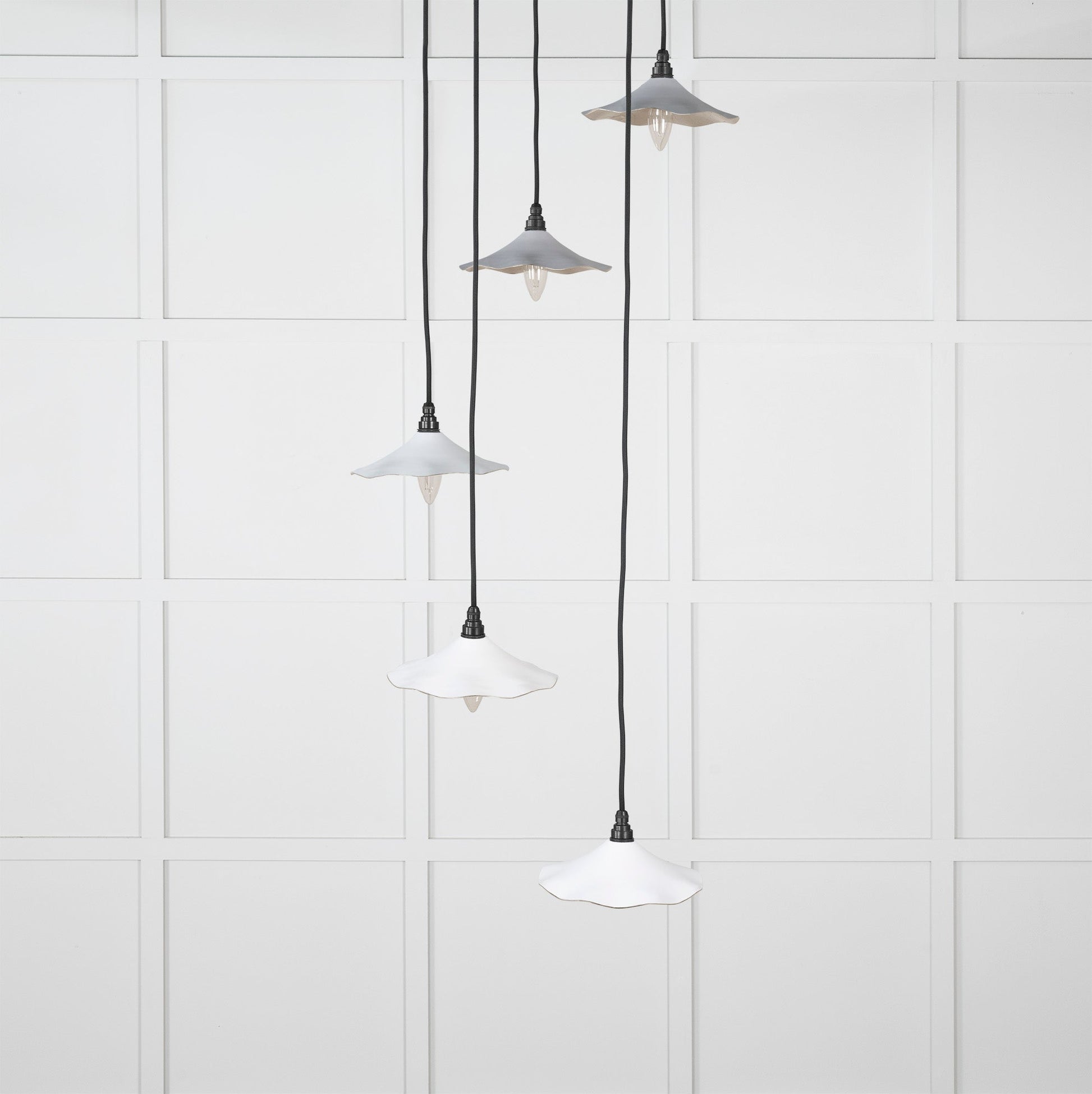 - Features five matching pendants suspended at different heights for a dynamic effect