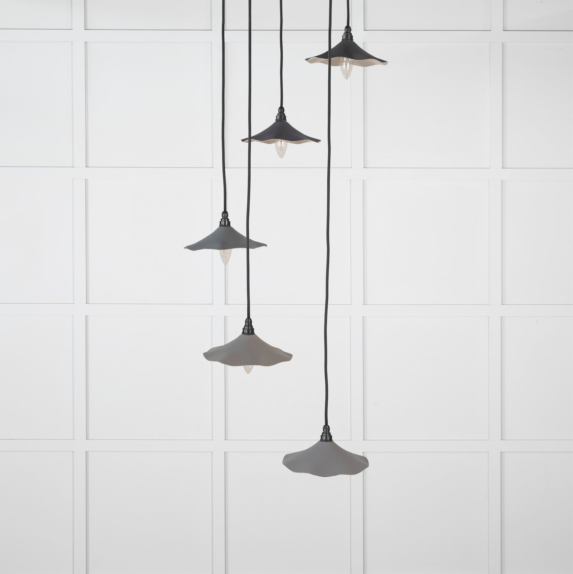 This elegant cluster pendant showcases five graceful, petal-inspired lights suspended at varying heights from a striking ceiling rose. The arrangement creates a captivating display reminiscent of a delicate floral bouquet, with gentle curves that allow beams of light to cascade beautifully across the room. The finish has a refined, smooth sheen, subtly reflecting light and adding a contemporary touch to any décor.