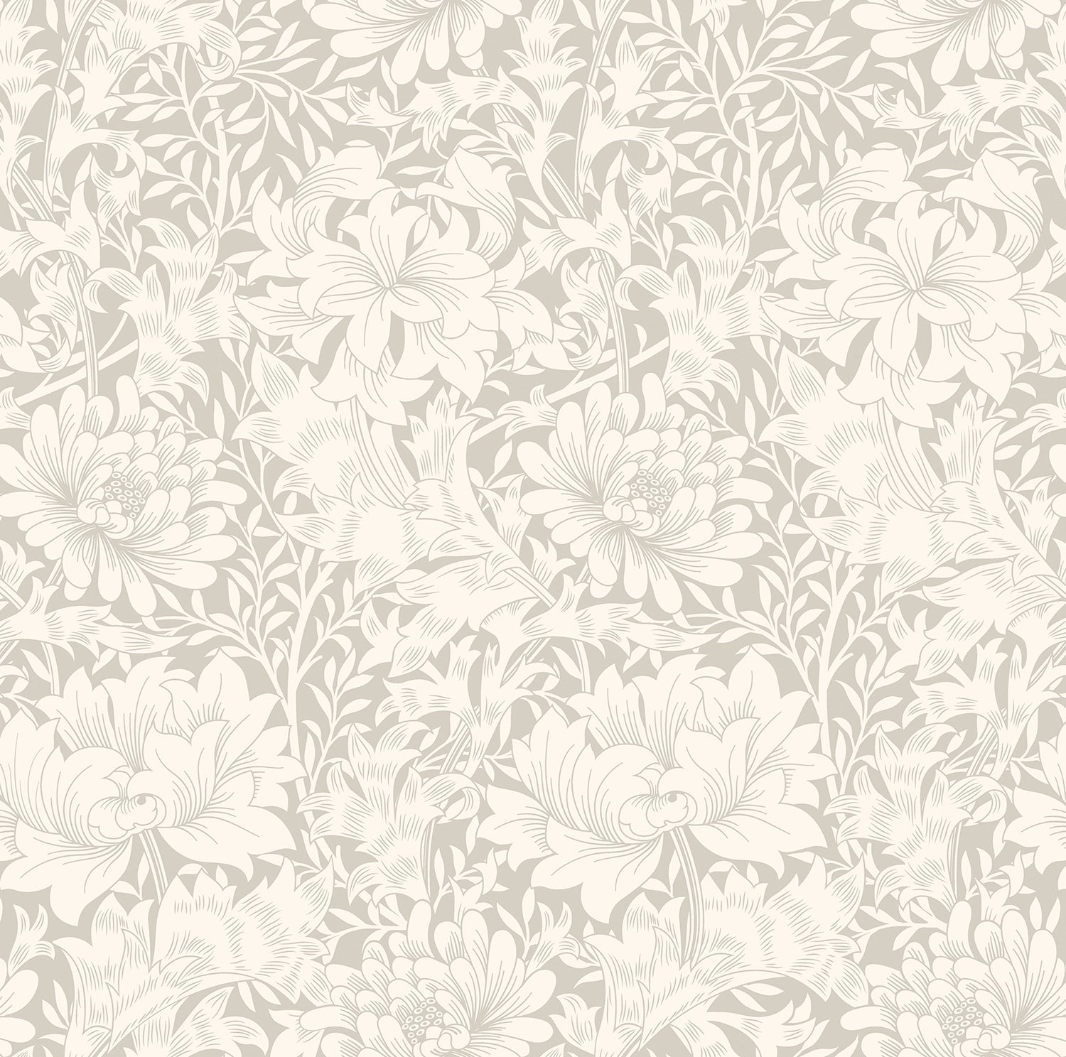 The image showcases a striking, ornate floral display with bold chrysanthemum blooms artfully entwined amongst leafy vines. The detailed flowers and foliage overlay a delicate, repeating small leaf motif, creating a harmonious yet visually impressive feature that elevates any room. The intricate pattern and refined dove-grey tones offer a contemporary interpretation of classic botanical style, bringing a sense of sophistication and tranquillity to the space.