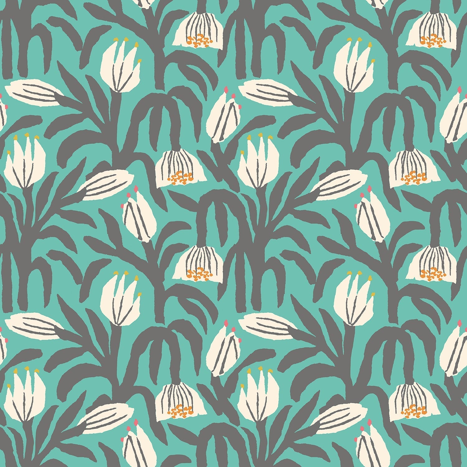 The featured image presents a charming, playful scene: chunky flower heads and arching leaves unfurl together in cheerful movement, complemented by splashes of lively teal blue. Pops of contrasting colour infuse freshness, while bold, clean outlines create a graphic, illustrative impression that captures the spirit of naïve art. This wallpaper’s vibrant visual impact would instantly uplift any room, providing a striking yet harmonious backdrop that appeals to both adults and children.