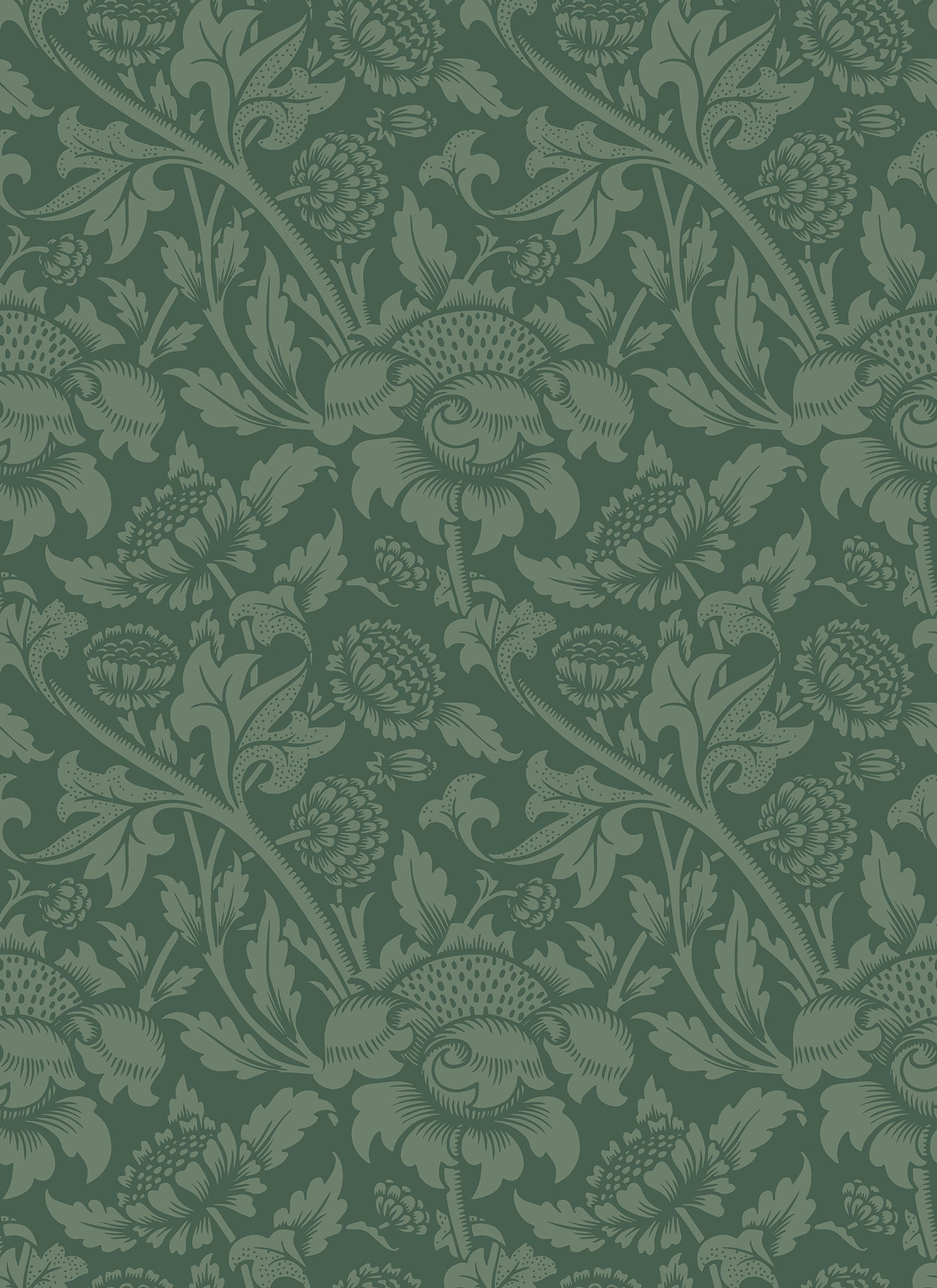 In the featured image, graceful, sunflower-like blossoms weave amongst flowing, verdant vines set against a rich forest green backdrop. The harmonious blend of botanical motifs creates an inviting, calming ambience, while the interplay of bold patterns and lush colour adds a refined touch to any room. The overall impression evokes historic botanical illustrations, with a palette and patterning that feels opulent yet distinctly contemporary.