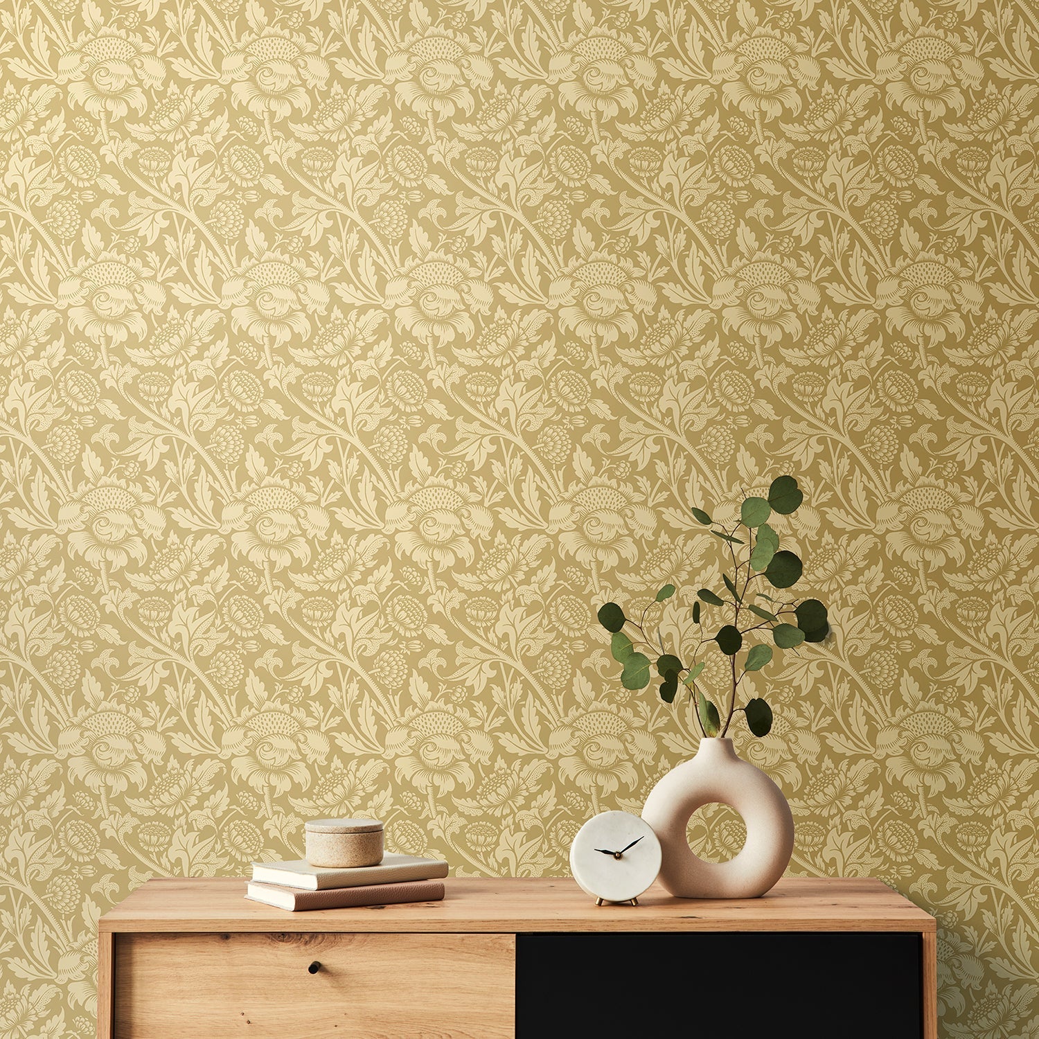 The visual impact of the Damask Trail Hemp wallpaper is unmistakable. This striking piece showcases luscious sunflower-like blossoms intertwined with sweeping, elegant vines. The grand botanical motifs are rendered in a way that lends both opulence and serenity to any room, while the subtle hemp-toned backdrop enhances the naturalistic theme. The overall composition evokes the refined grace of historical botanical illustrations, promising to bring an air of sophistication wherever it is placed.