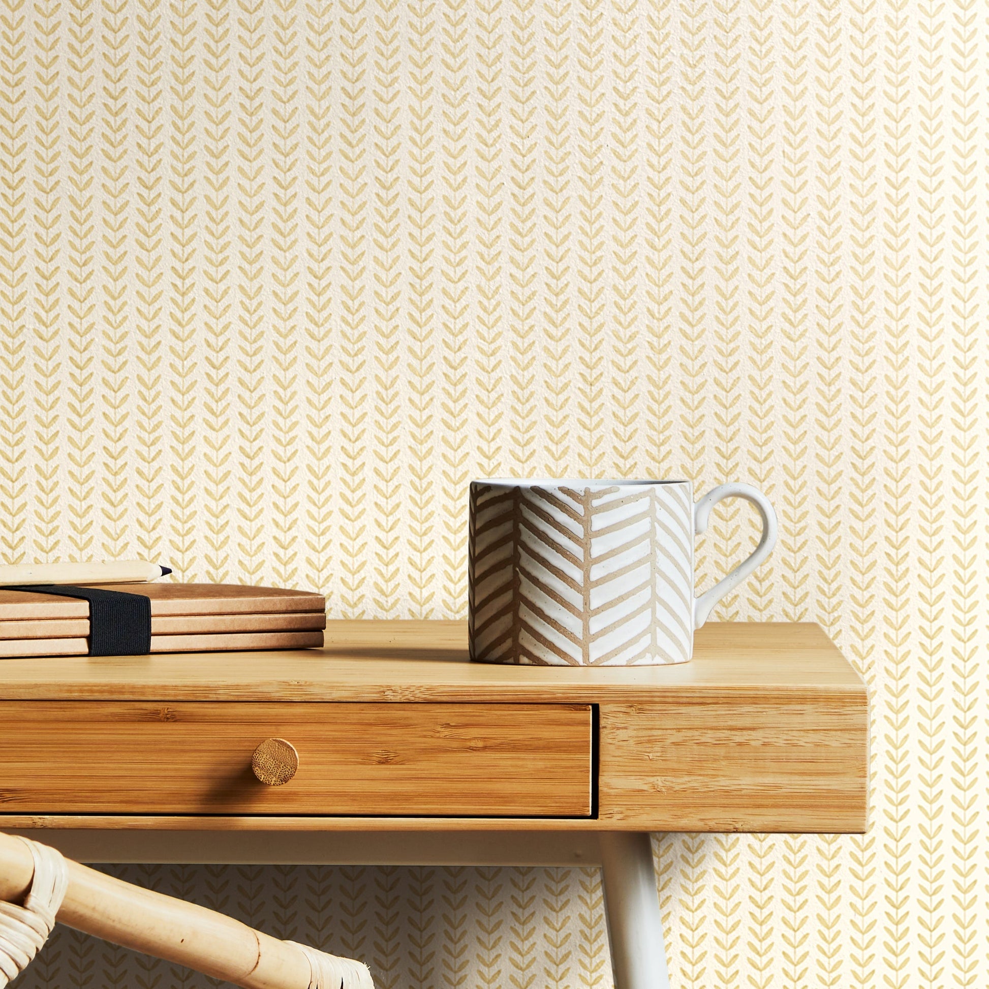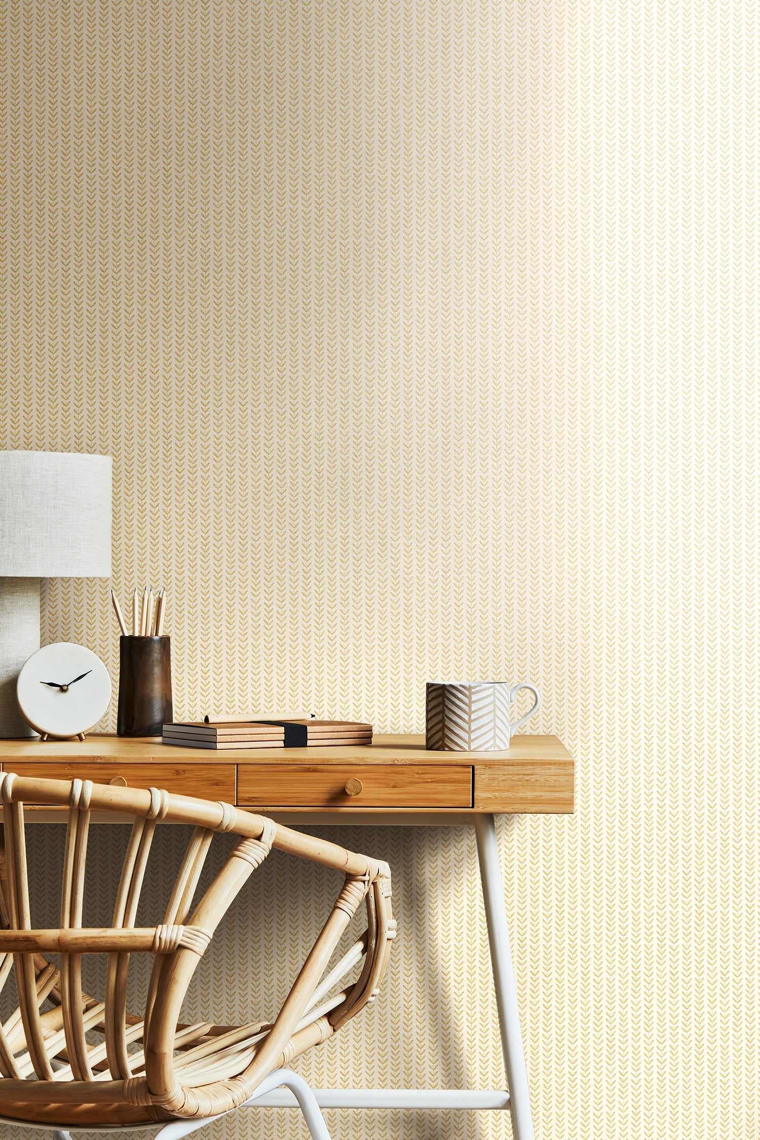 The image captures a tranquil and inviting backdrop, with soft, yellow-toned stripes graced by dainty, intricate leaf motifs. The delicate nature-inspired pattern gently alternates across the surface, imparting a feeling of calm and subtle texture, perfectly suited to both modern and classic interiors.