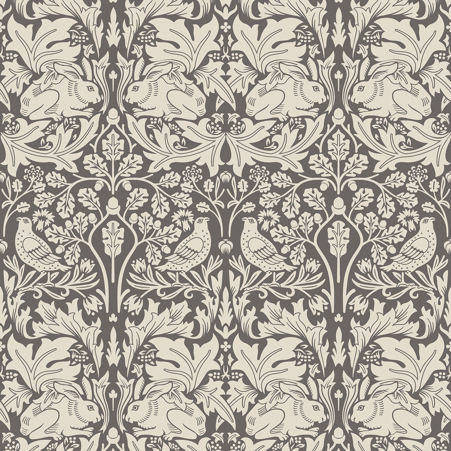 The Hoopla Walls Forest Rabbit Charcoal Grey wallpaper captures the eye with its exquisite hand-drawn imagery. The design is alive with charming rabbits nestled amongst a lush landscape of foliage and graceful birds, all rendered in calming charcoal grey tones. The scene beautifully combines whimsy and tranquillity, evoking a gentle woodland escape within your home.