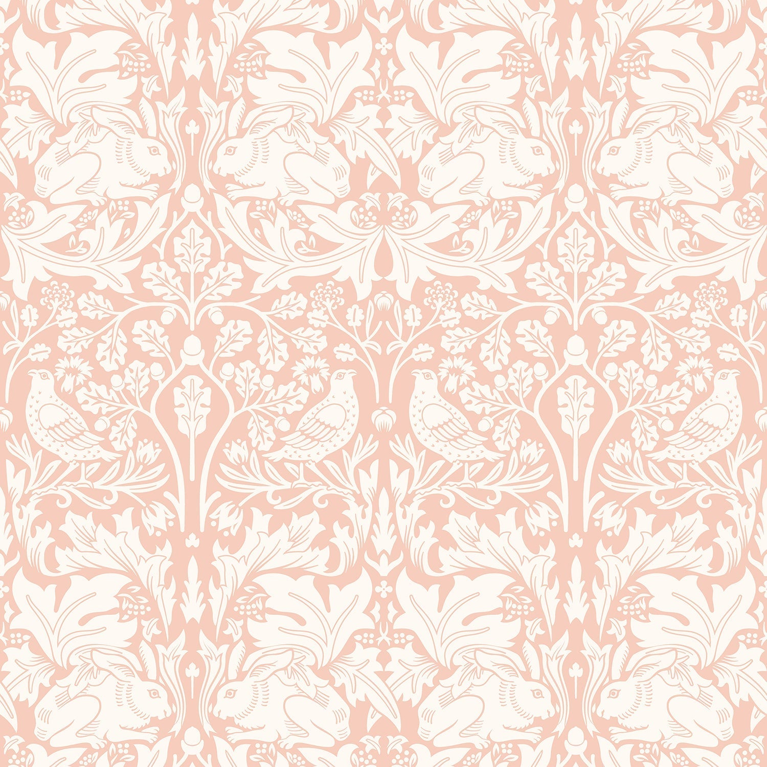 The wallpaper’s design showcases a delightful scene: hand-drawn rabbits darting among lush foliage, intertwined with songbirds amidst flourishes of leafy greenery. Set against a gentle soft pink background, the illustration introduces an air of tranquillity and whimsy, evoking the soothing essence of a woodland glade just as dawn breaks. The overall look is elegant yet playful, with the tonal pink palette lending warmth and comfort to any room.