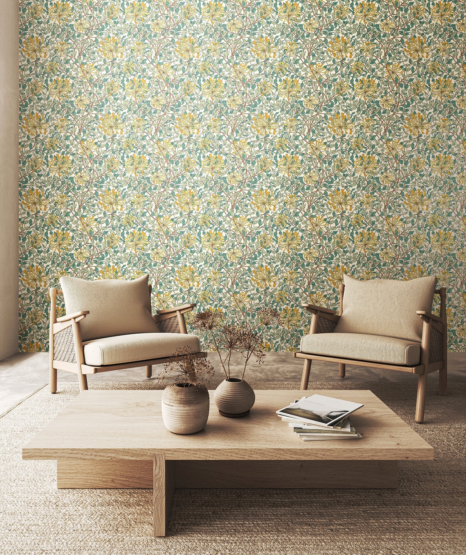 The Hoopla Walls Honeysuckle Leaf Trail Seafoam wallpaper combines realistic botanical elements with a sophisticated colour palette, making it an easy choice for those looking to enhance any living space with elegance and character. Transform your home into a serene haven, where tradition meets modern design sensibilities through this exquisite wallpaper.