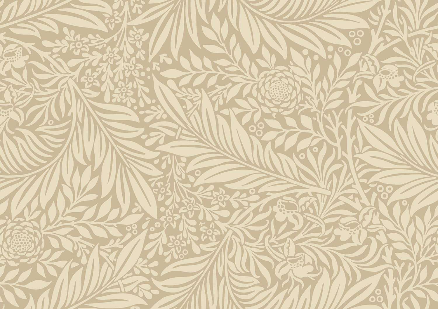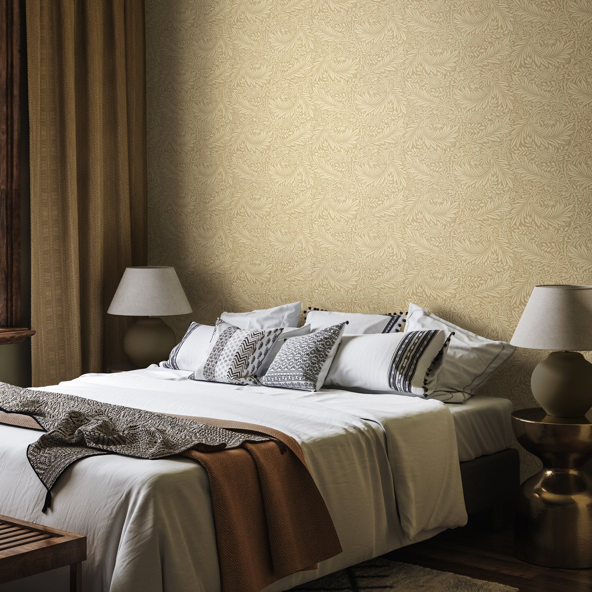 In the image, delicate vines curl fluidly across a soft, straw-toned background, adorned with finely detailed leaves and subtle floral motifs. The overall impression is one of gentle movement and natural beauty, evoking a serene yet timeless atmosphere. Soft dotted highlights enhance the pattern, lending a sense of depth without overwhelming the senses.