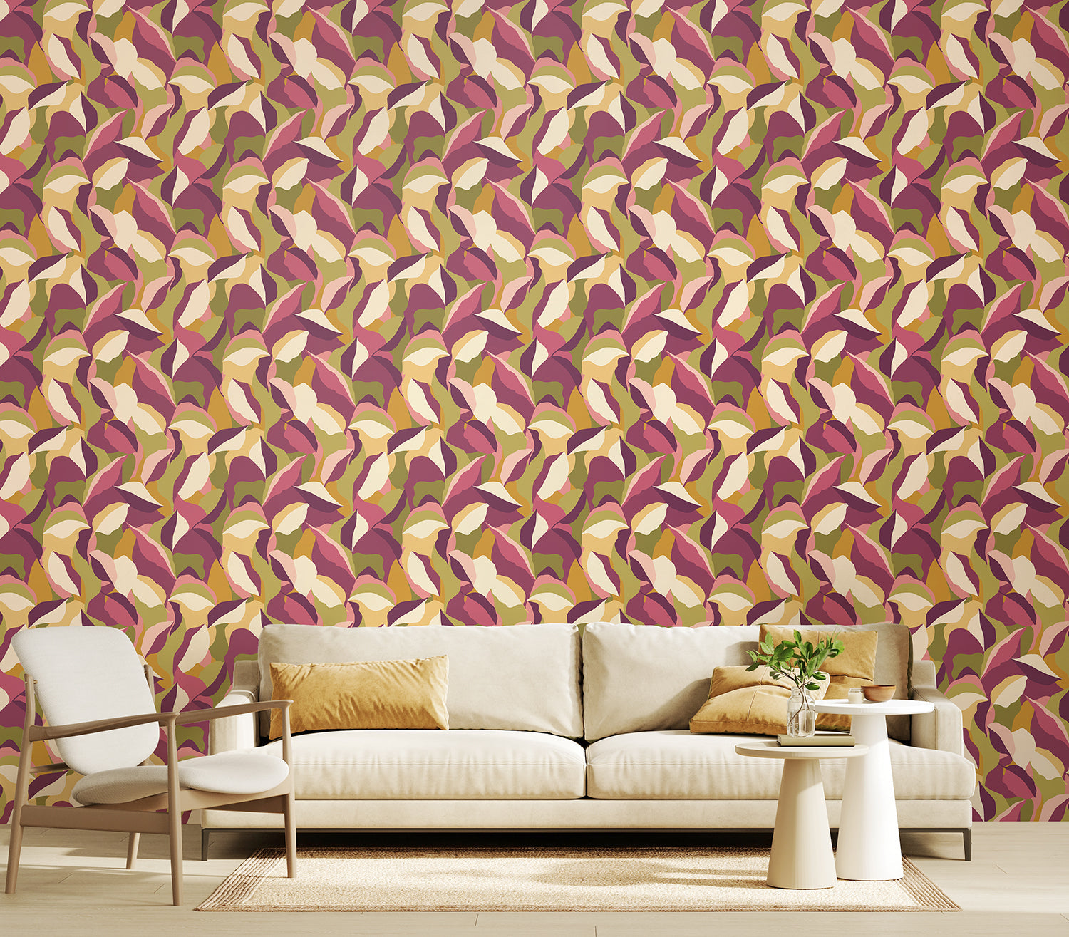 The image showcases a mesmerising display of abstract leaf forms, seamlessly interconnected in a rhythmic, patchwork arrangement. The artistry employs rich hues of plum and olive, punctuated by lively splashes of colour, creating a multi-layered effect that draws the eye and invigorates the senses. The design brings together organic motifs and geometric composition, crafting an interior wallpaper that is visually captivating and elegant.