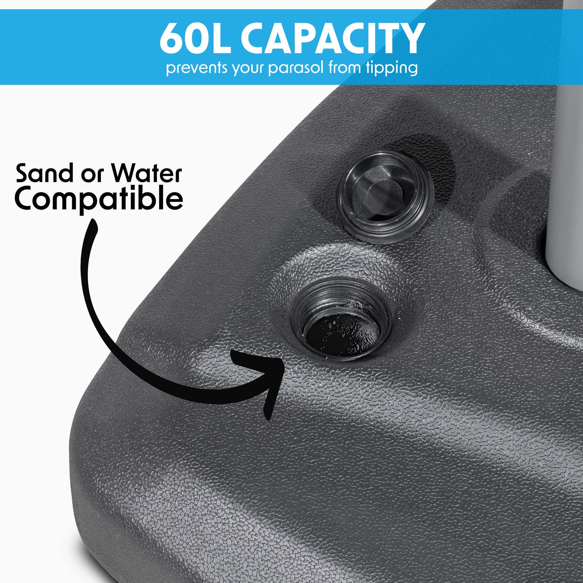 - Everything you Need - Supplied with 60L base which is fillable with either water or sand and a cover to protect the parasol canopy when not in use.