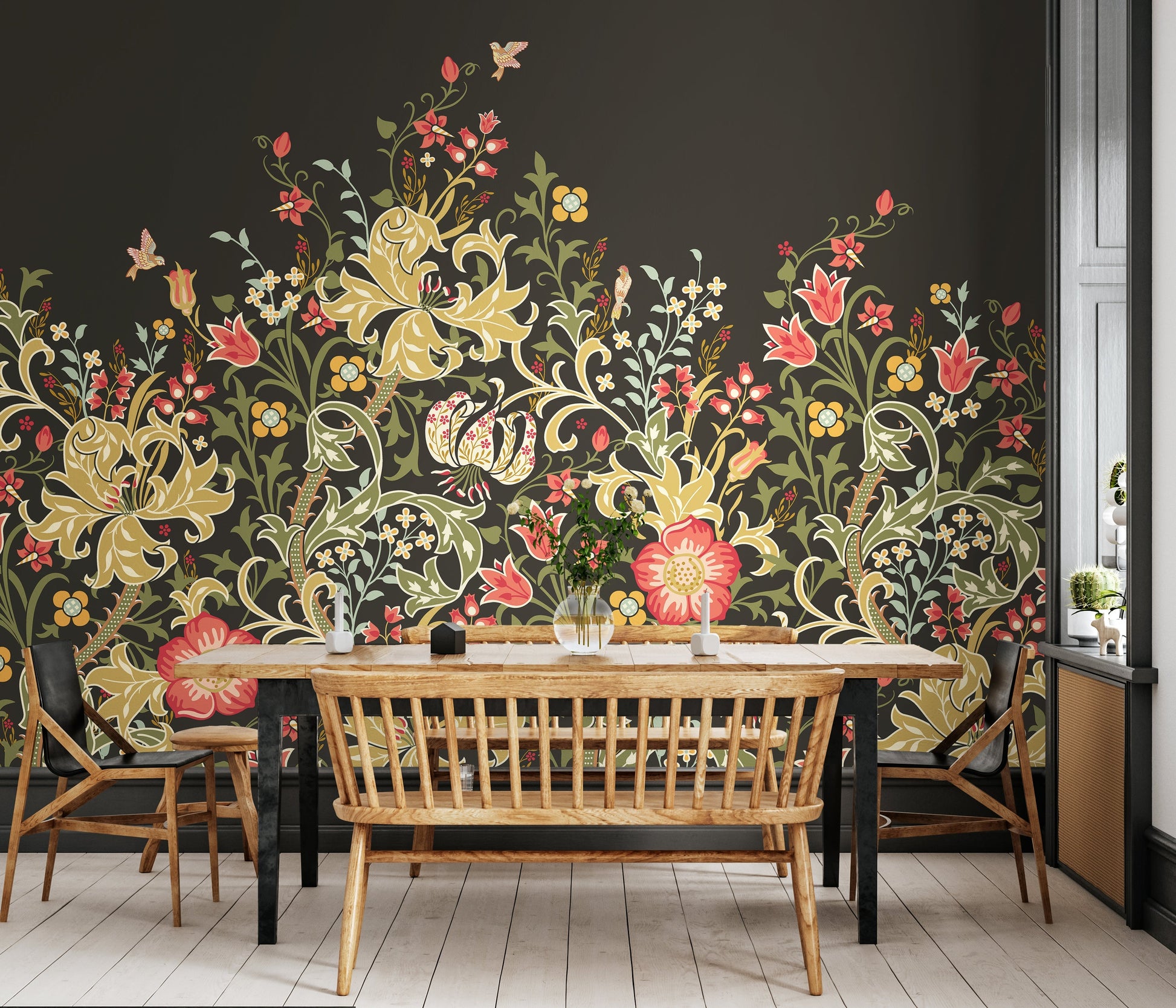 The mural portrays an enchanting scene: large, stylised lily flower heads intertwined with scrolling foliage tendrils, all gracefully winding along a subtle ogee trail. Lush florals in confident colours stand out against an atmospheric midnight backdrop, capturing the essence of classic British artistic heritage with a modern twist. The overall effect is vivid, elegant, and effortlessly bold.