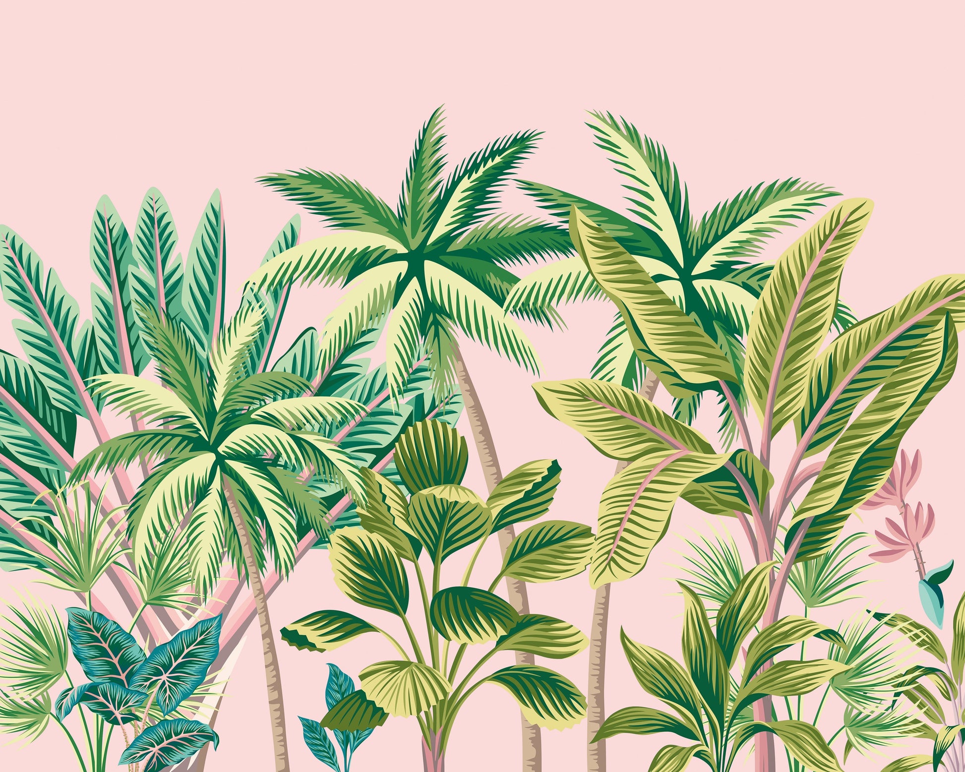 The lively design displays a flourishing array of swaying palm trees set against a chic pink backdrop, alongside lush banana leaves and captivating exotic foliage. The image seduces the senses with its abundance of vibrant hues, inviting you into a tropical paradise where boldness and relaxation meet. It radiates an energetic yet calming atmosphere, transforming your room into an oasis of modern elegance and warmth.