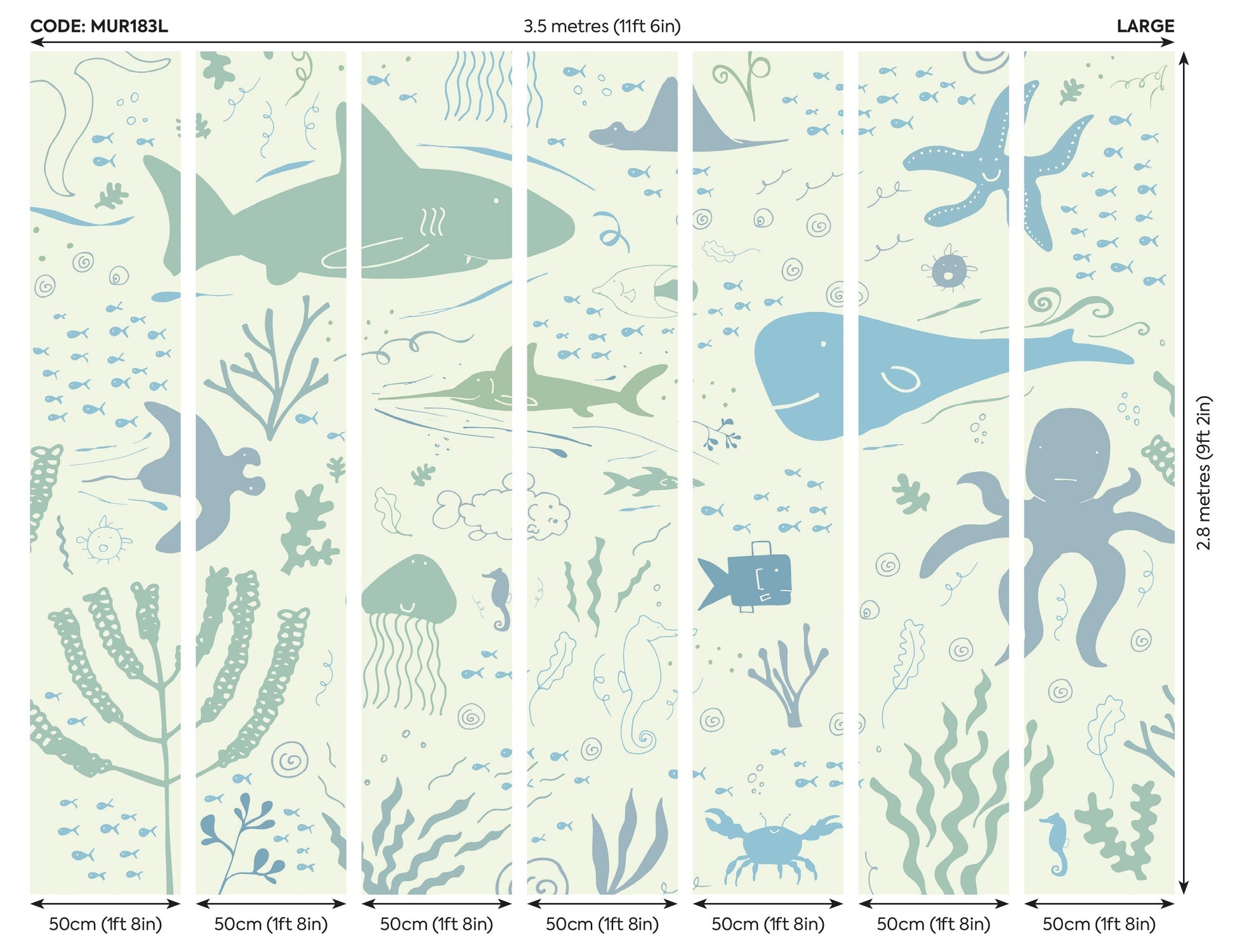 The Origin Murals Underwater Adventures Seafoam 350cm X 280cm wallpaper by Origin Murals offers an enchanting escape into the mysterious world beneath the waves. Carefully curated to spark the imagination, it creates a captivating feature wall that will inspire both adults and children alike. The soothing seafoam tones and vivid illustrations invite you to explore every corner of this aquatic paradise, all from the comfort of your living space.