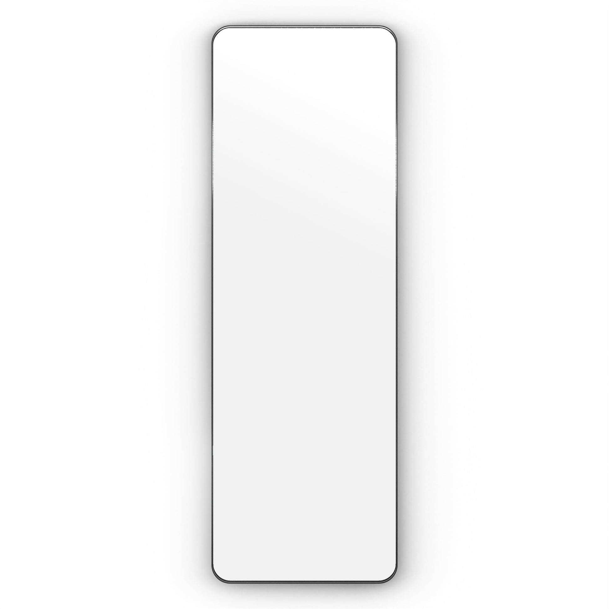 The image displays a sleek, rectangular mirror encased in a deep matt black frame, its smooth edges accentuating the minimalist yet bold aesthetic. The mirror sits slightly recessed within the frame, drawing the eye to its clean lines and refined curved corners. Whether mounted in portrait or landscape orientation, its striking presence becomes a focal point in any modern interior.