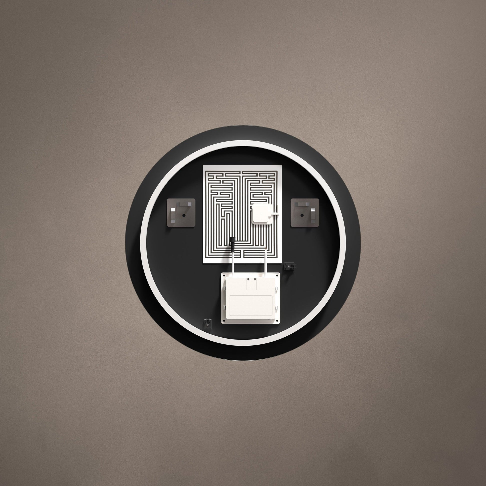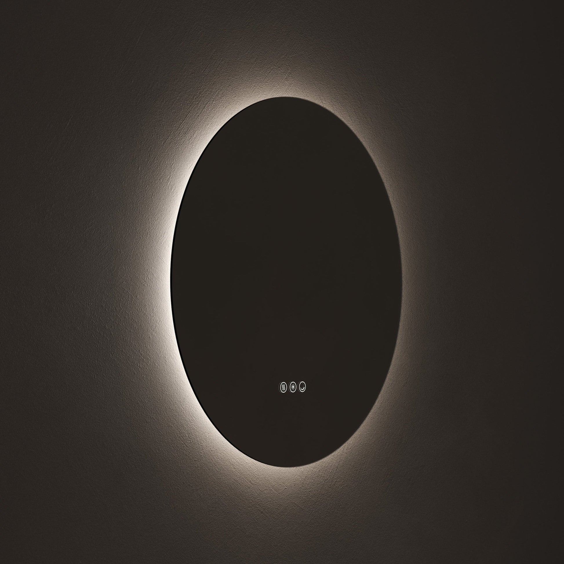 The image showcases a striking round mirror with radiant, dotless LED illumination gently tracing its perimeter, creating a soft yet vibrant glow that effortlessly enhances the atmosphere. Its contemporary silhouette and sleek finish present a modern yet timeless appeal, effortlessly complementing a variety of bathroom décors. The control is subtly embedded, highlighting a seamless aesthetic with an intuitive interface.
