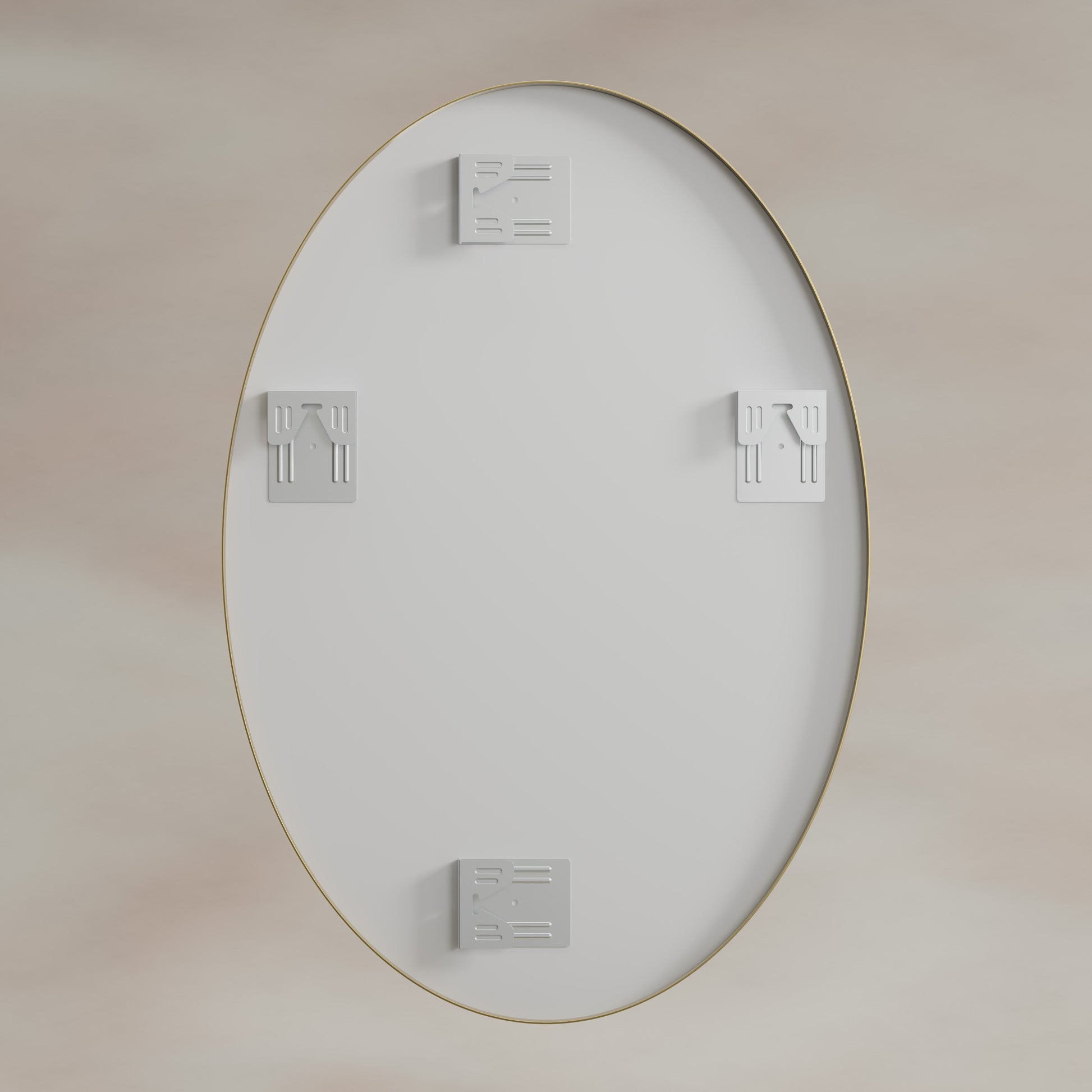 The image displays a stunning oval mirror graced by a frame in a brushed brass finish. Its smooth and gently curved edges provide a refined focal point, while the softly reflective surface sits elegantly within a luxurious border. The brass frame emits a warm, golden glow, accentuating the mirror's chic modern aesthetic and enhancing the atmosphere of any room.
