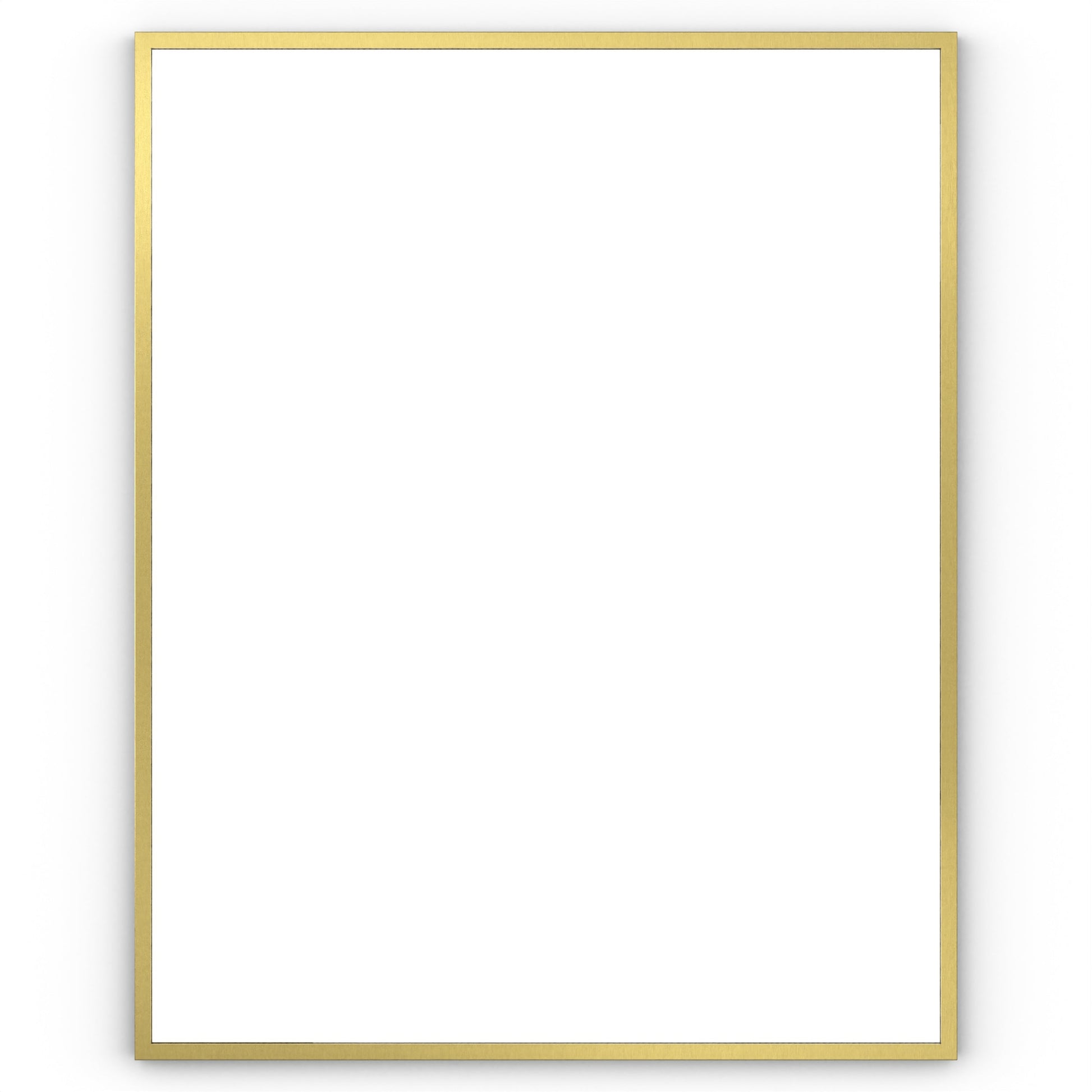 The mirror features a sleek, brushed brass frame with pronounced, clean lines that creates a bold, industrial-inspired outline. The radiant metallic finish softly reflects ambient light, while the refined rectangular shape lends a gallery-like sophistication to the surroundings. Its surface perfectly captures the environment, enhancing both natural and artificial lighting for added depth and atmosphere.