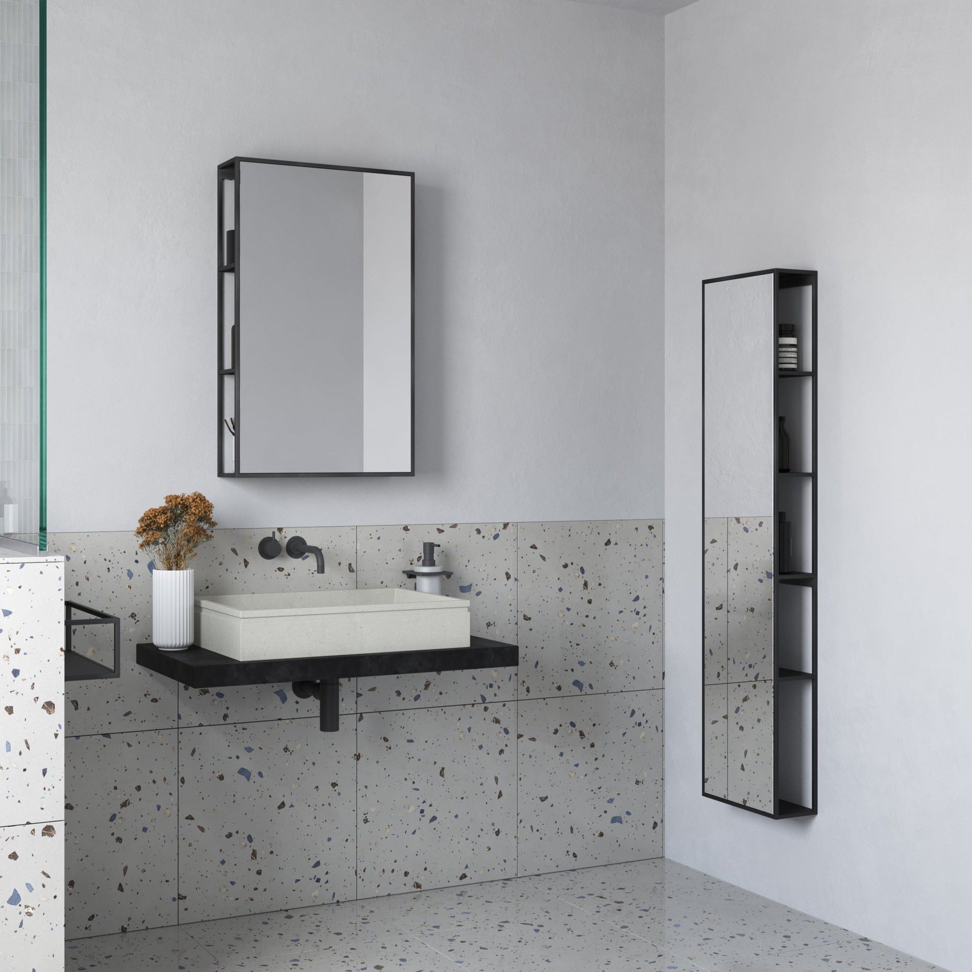 The Origins Living Dockside Mirror With Open Shelving by Origins Living features five open shelves, accessible from either side. One of the shelves at the bottom is more spacious, ideal for storing taller items such as lotions or decorative vases. With its non-illuminated full-length design and modern angular edges, this mirror offers both function and style in equal measure, making it an exceptional solution for those seeking additional storage combined with refined aesthetics. As part of the Origins Living Dockside and Origins Living Storage range, it ensures reliability and longevity, backed by a five-year guarantee.