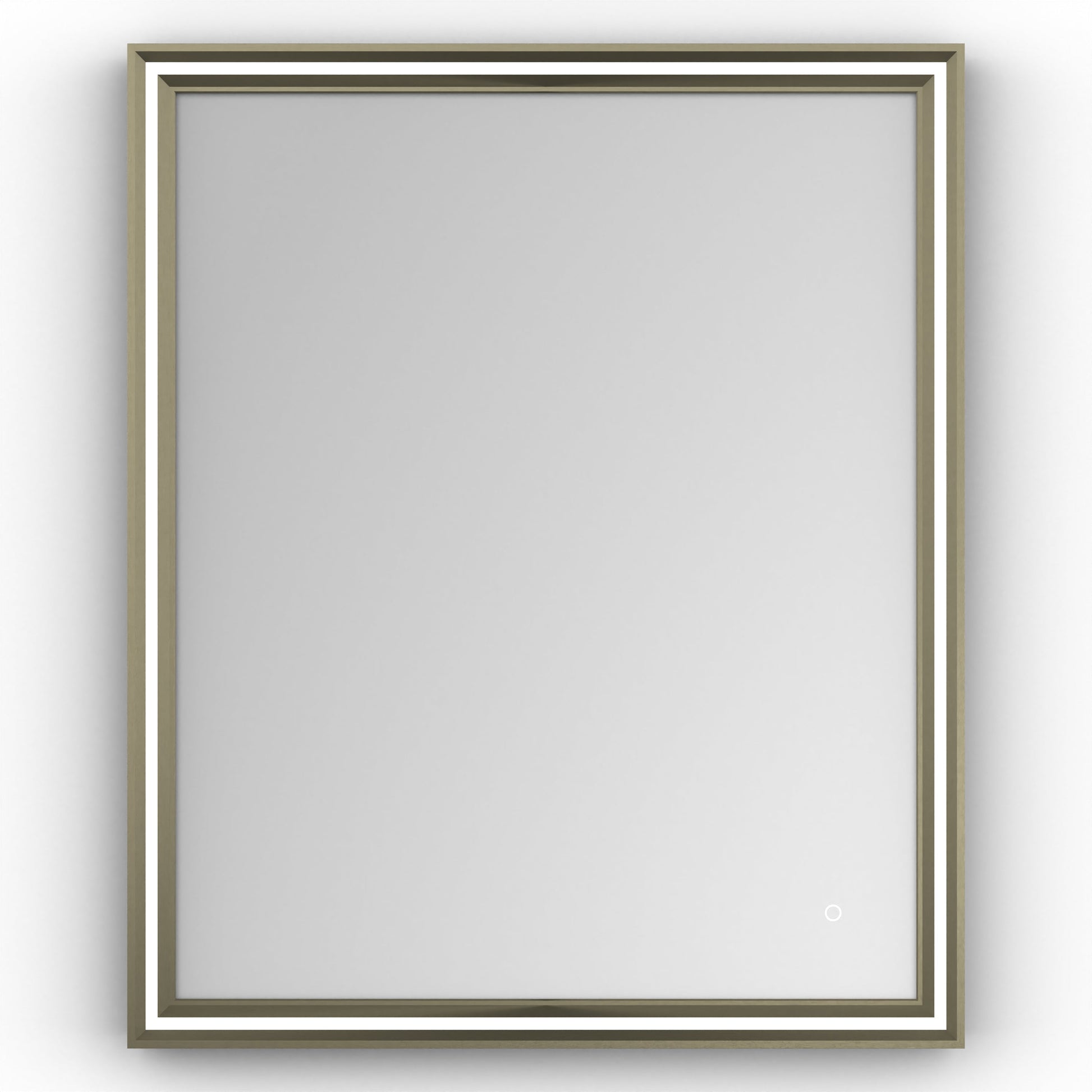 The image showcases a sleek rectangular mirror bordered by a luxurious brushed bronze frame. Soft, even lighting radiates from behind the edges, creating a warm yet vibrant glow that accentuates the refined Art Deco-inspired styling. The sophisticated touch controls are seamlessly integrated onto the glass, adding a state-of-the-art finish to its classic allure. Whether displayed vertically or horizontally, the mirror’s glass remains crystal clear even after a steamy shower, maintaining its pristine reflective quality.