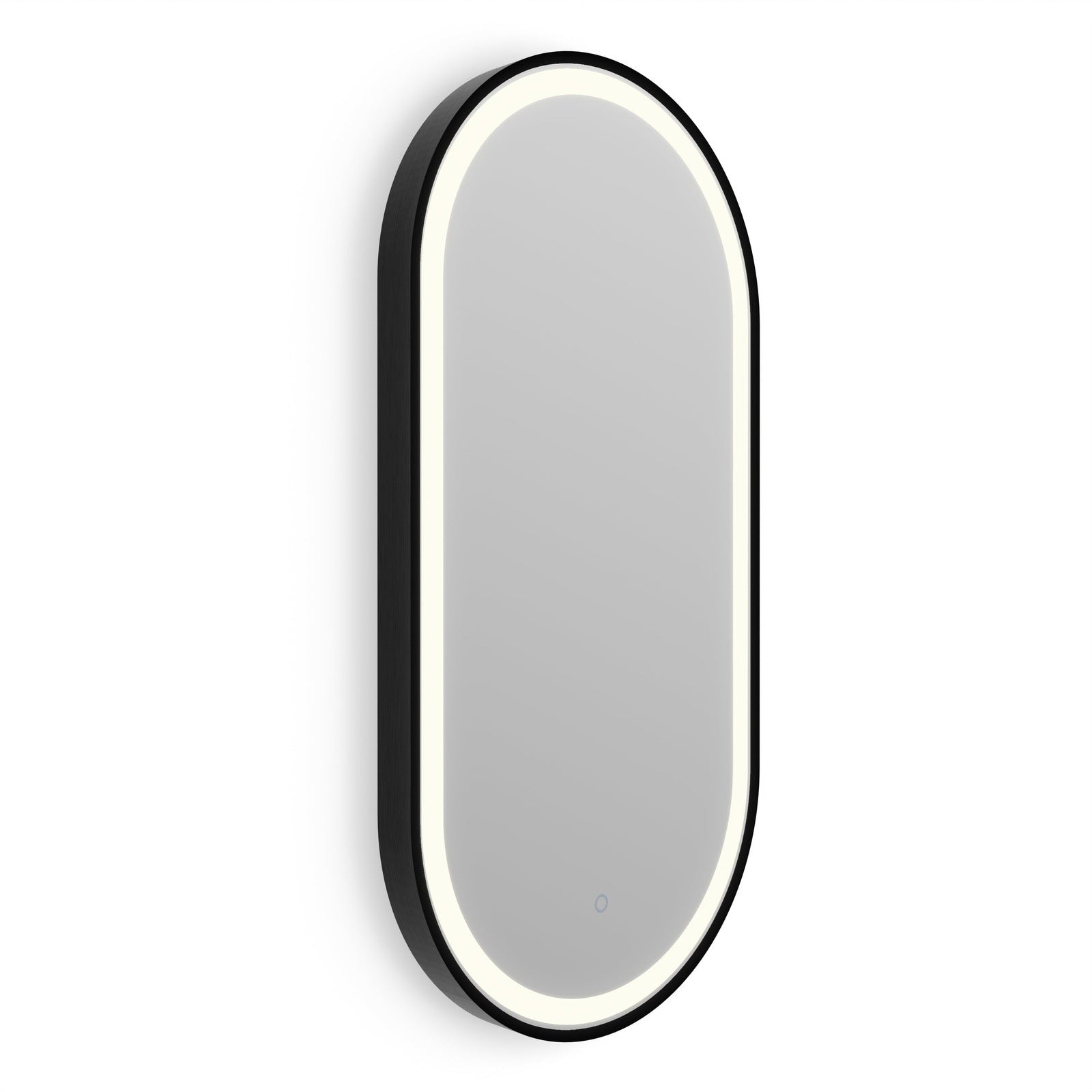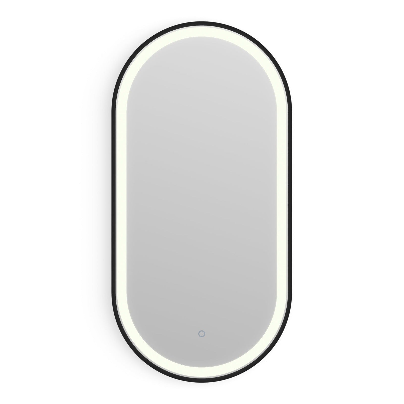 The mirror features a unique capsule shape, perfectly complemented by a sleek brushed black frame. Its modern aesthetic is enhanced by a striking oversized border, creating a bold focal point in the bathroom. The backlit panel emits a soft daylight-white glow, casting even illumination across the surface—ideal for grooming and enhancing the overall ambience. With its minimalist lines and sophisticated finish, this piece brings a touch of refined luxury to any compact space.