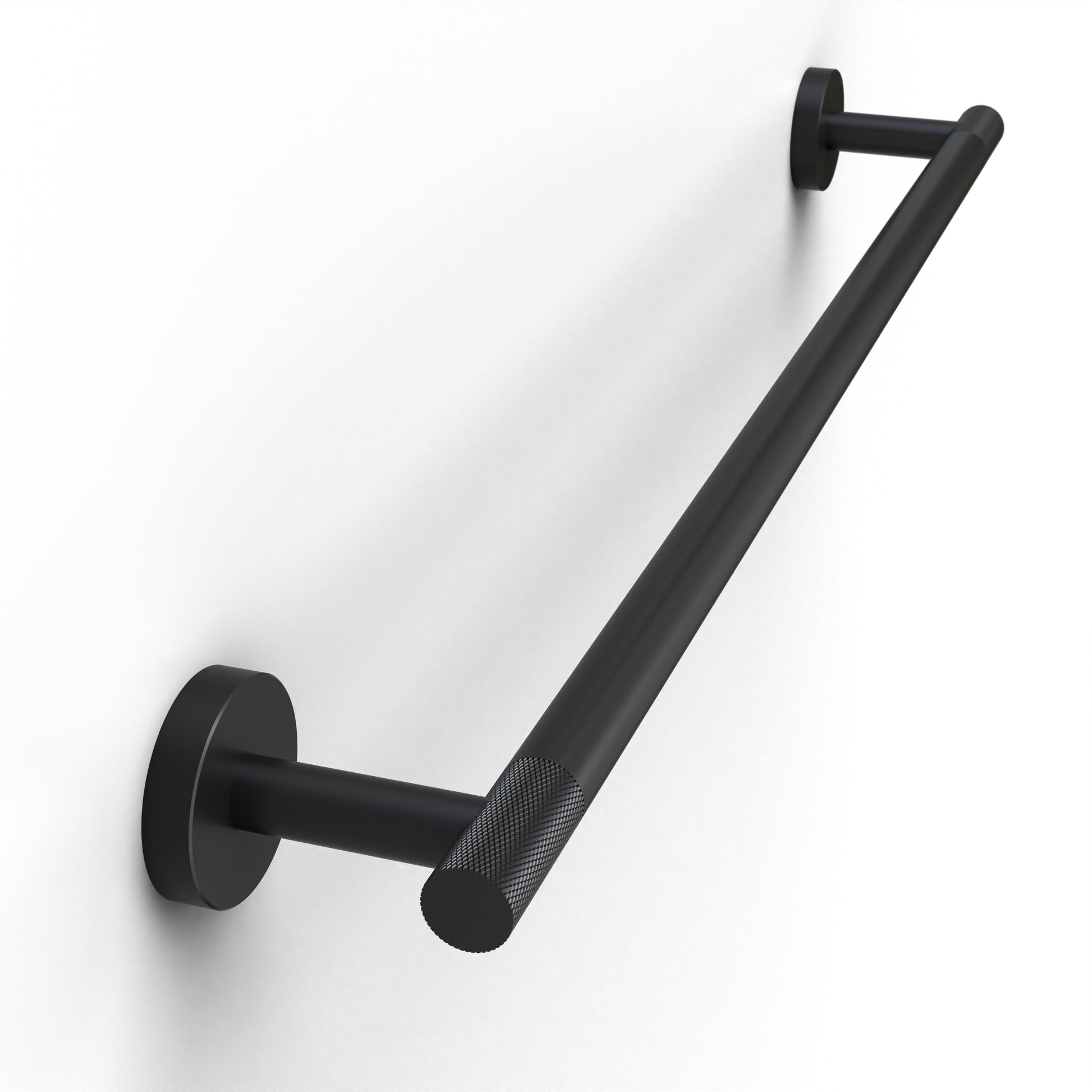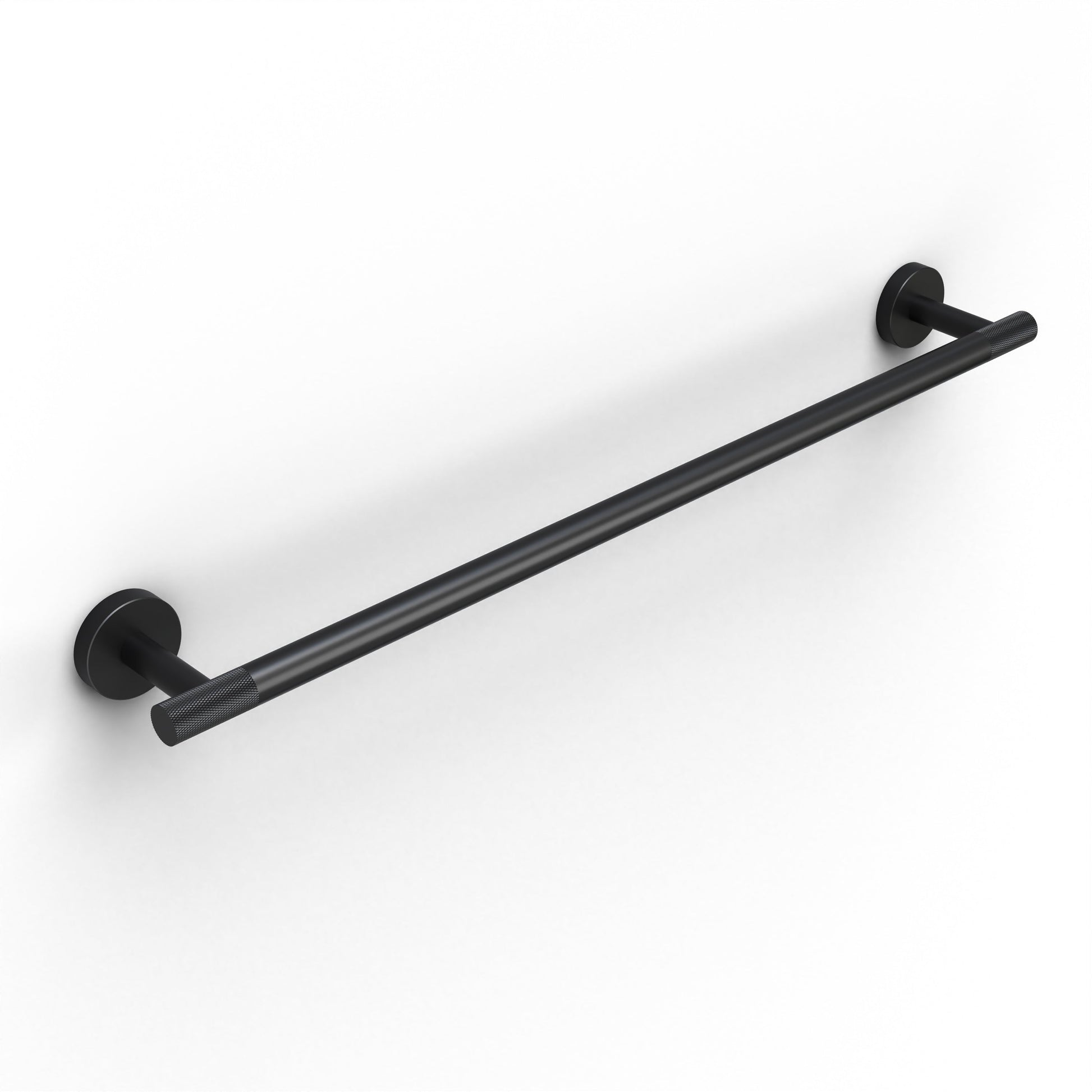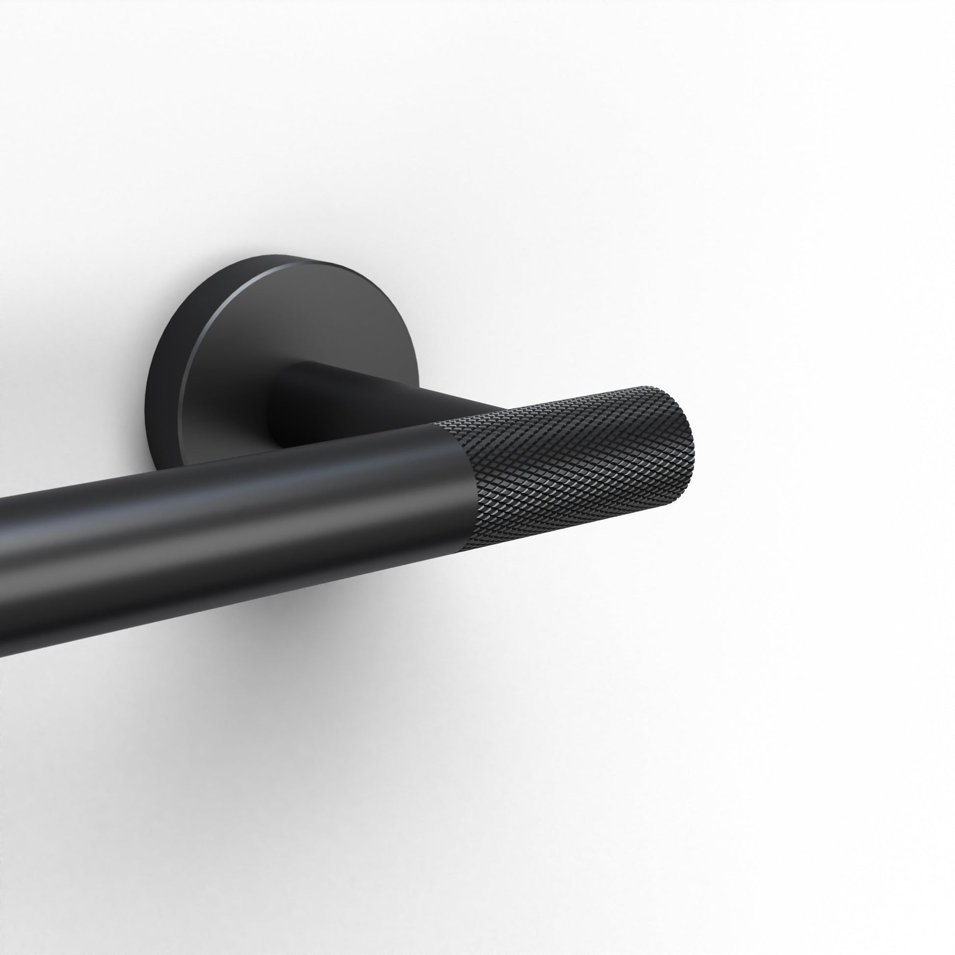 The image captures a beautifully sleek towel rail with a bold, matte black finish. Its streamlined, minimalist profile is complemented by distinctive knurled detailing at each end, which adds visually appealing texture. The rail’s seamless installation ensures there are no visible fixings, allowing the striking finish and refined lines to stand out elegantly in any bathroom setting.