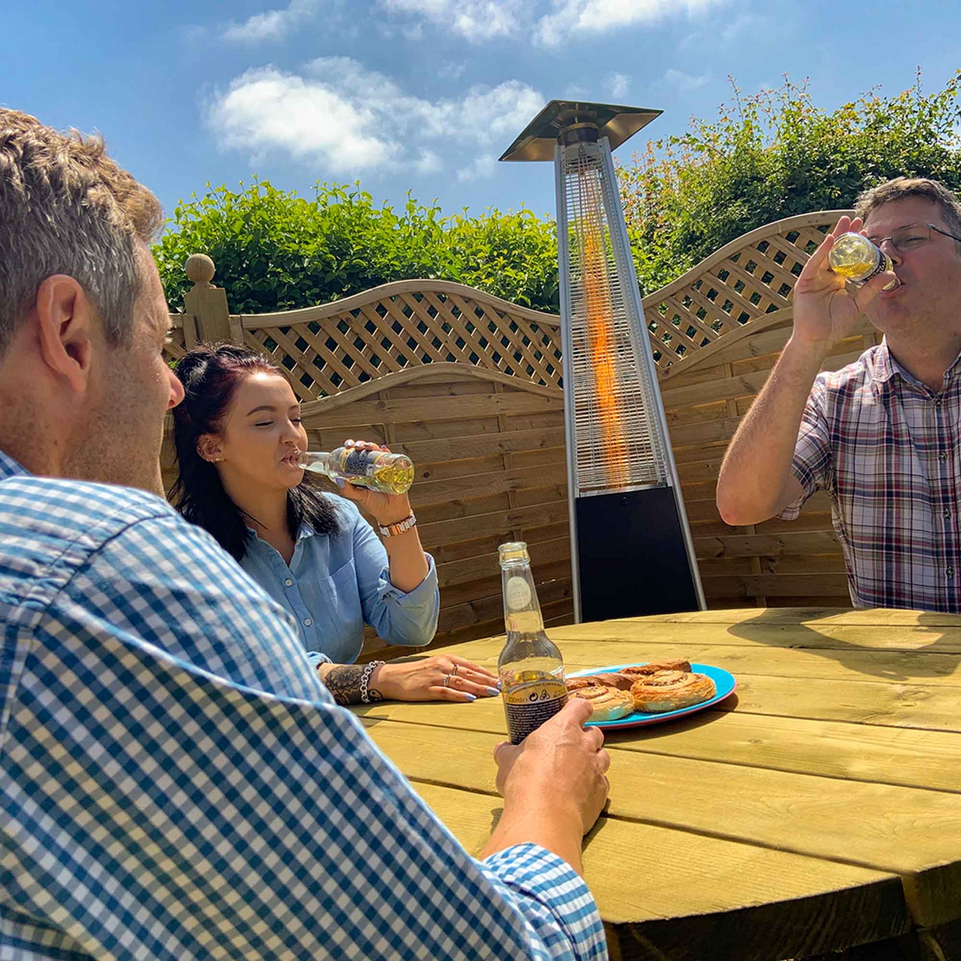- Innovative Design - This gas flame pyramid stands at 2.27m tall, when lit the heater produces a real flame encompassed by a glass tube and heats the surrounding area. A metal reflector makes sure the heat is directed downwards and outwards.