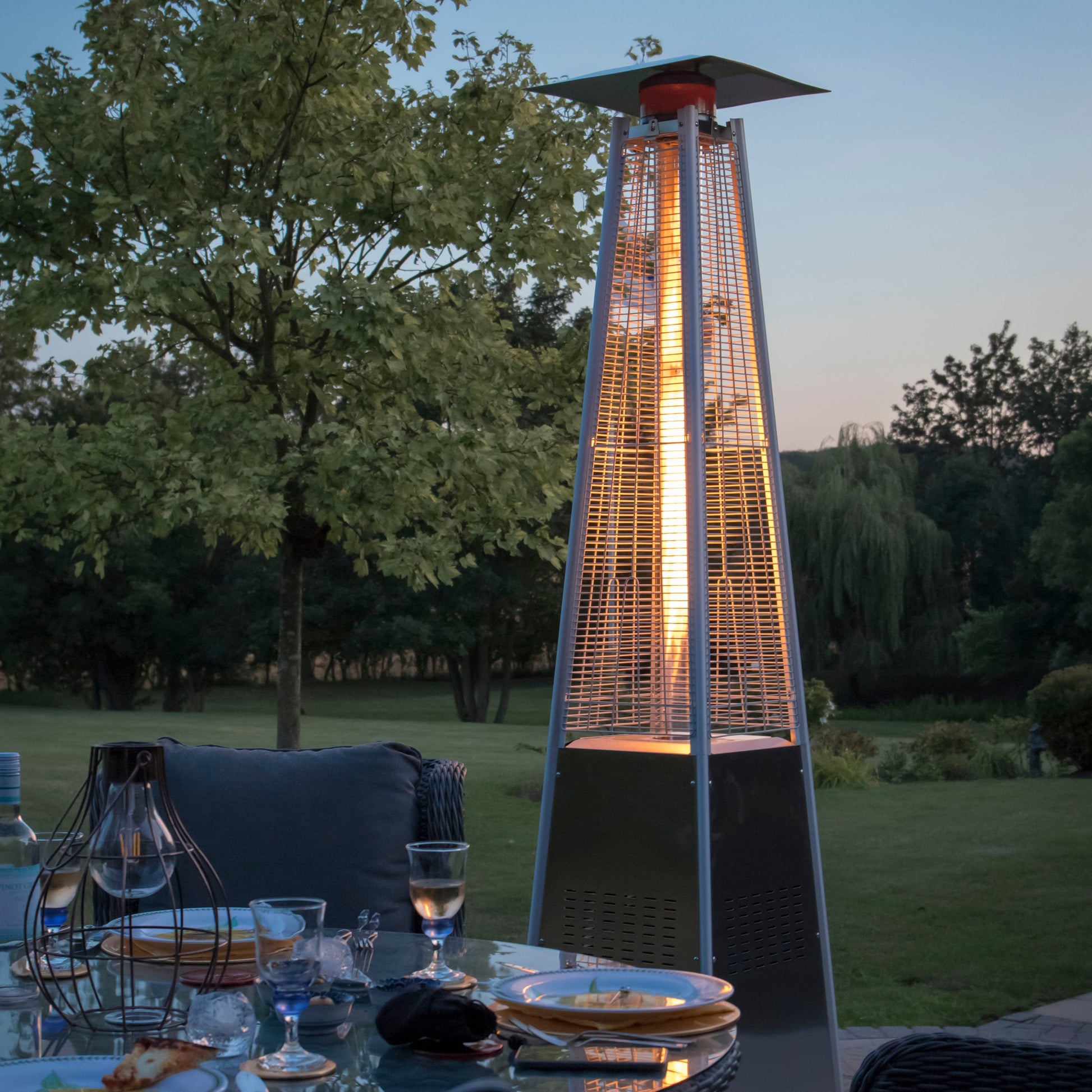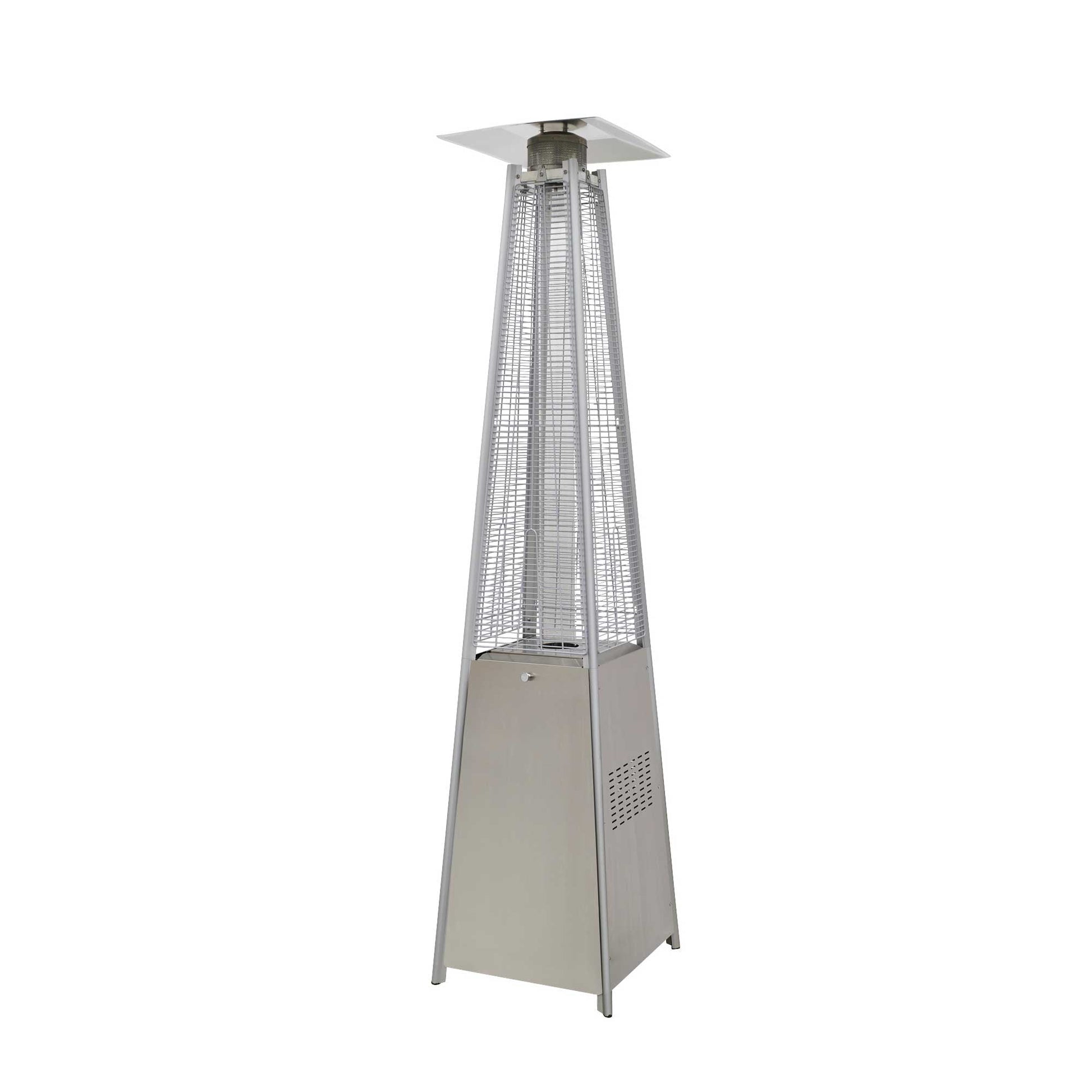 - Innovative Design - This gas flame pyramid stands at 2.27m tall, when lit the heater produces a real flame encompassed by a glass tube and heats the surrounding area. A metal reflector makes sure the heat is directed downwards and outwards.