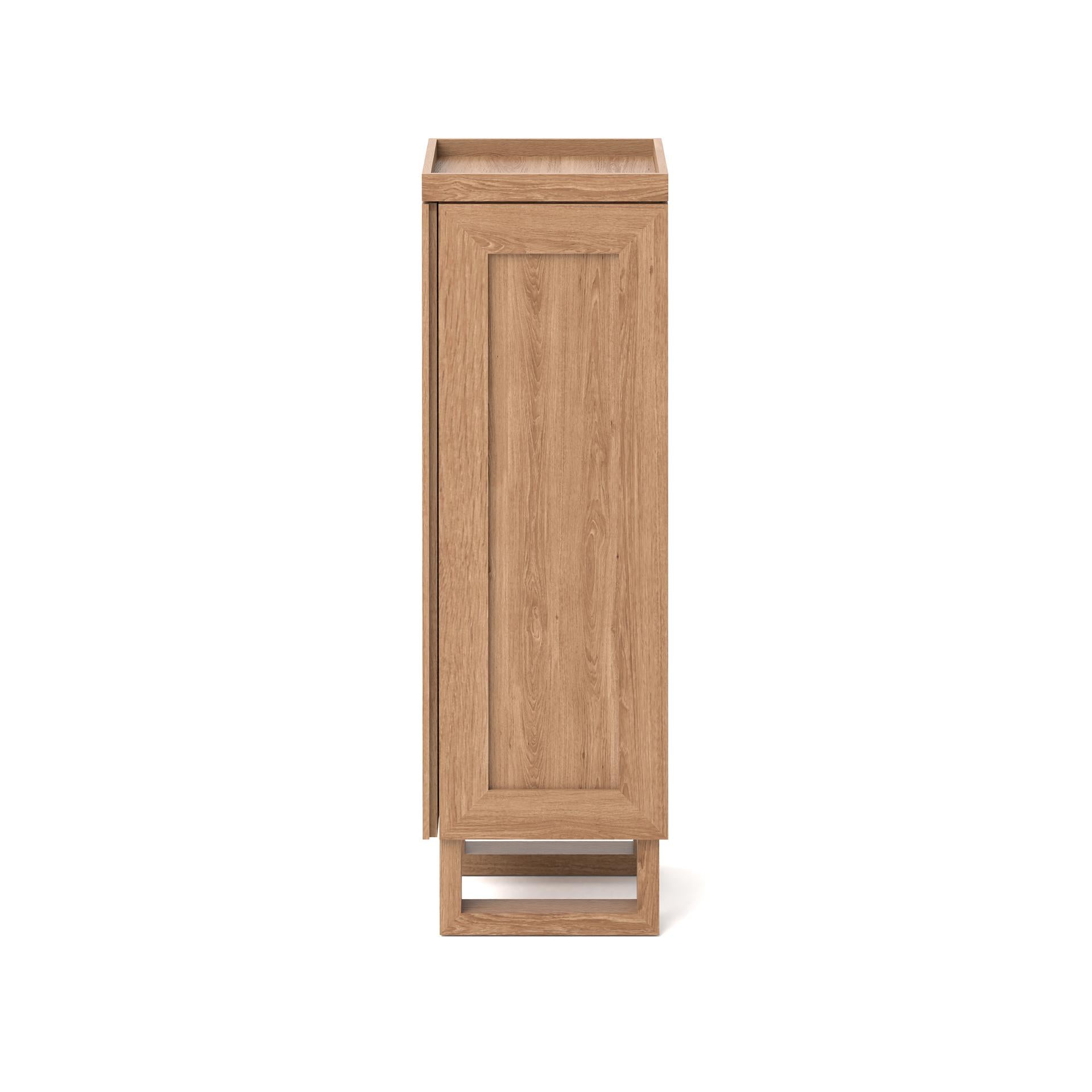 The ingenuity of the design is evident in the Wireworks Tallboy Mezza Oak’s thoughtful features and flexibility, as described by Wireworks using the latest in sustainable wood innovation. This tallboy offers right-hand opening as standard, but can be easily converted for left-hand openings to suit your space. The concealed fingertip groove allows for seamless, handle-free access, maintaining a tidy, uncluttered exterior. The tallboy’s surface is treated with a matt, water-resistant lacquer, ensuring longevity in humid environments.