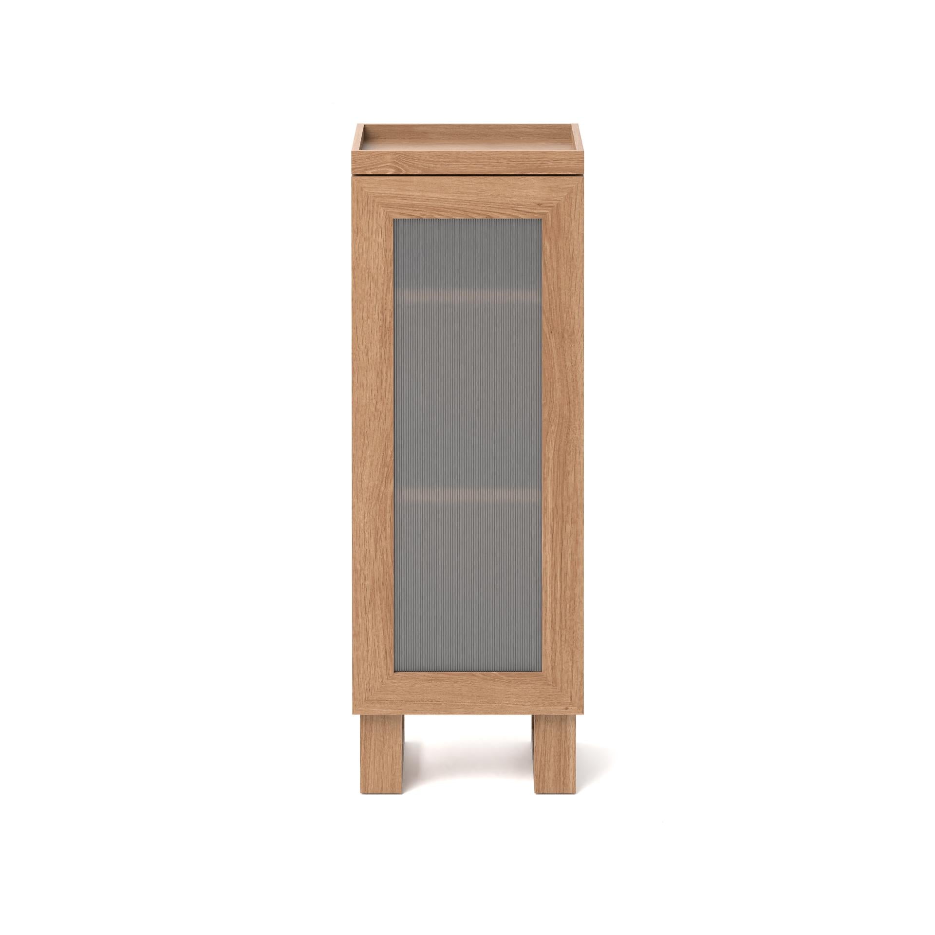 The Wireworks Tallboy Mezza Oak is from a well-known brand, celebrated for its distinguished designer pieces and outstanding quality. The tallboy presents a sleek, modern silhouette with smooth corners, exuding refined craftsmanship from top to bottom. Its surface boasts a beautiful lipped edge tray that keeps your essentials within easy reach while adding a touch of contemporary elegance. The front of the cabinet displays a striking rib-patterned, acid-etched glass window, subtly obscuring the contents while lending a sophisticated finish.